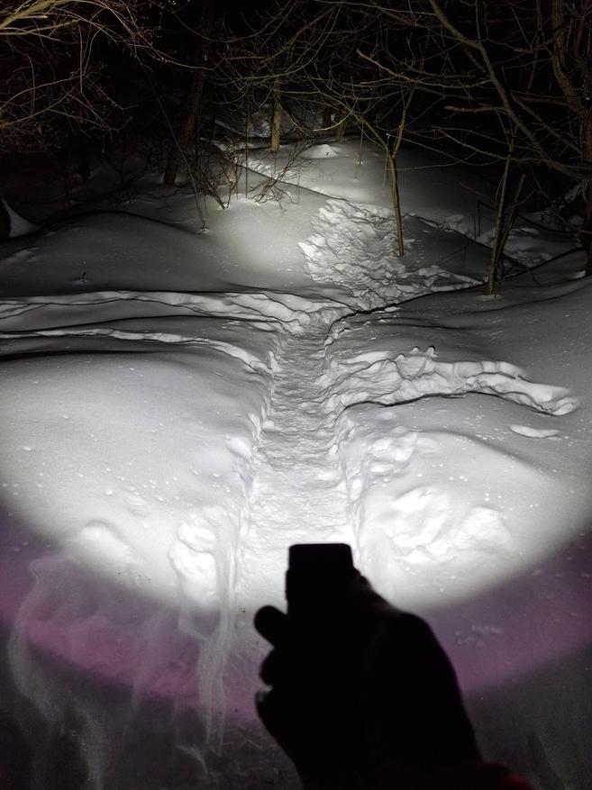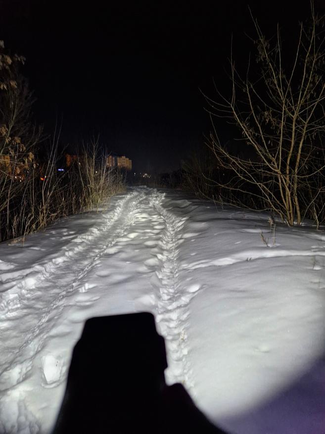 Угол освещения широкий, свет не только бьет вдаль, но и заливает рядом внизу. На 200 метров видимости луча на максимальной яркости вполне можно расчитывать. Но, а уверенно ходить по темным тропинкам можно на средних значениях 200-500 люмен.