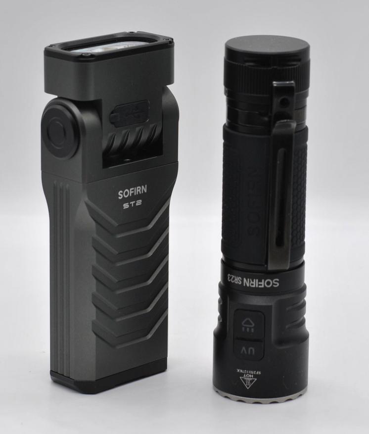 ST2 по сравнению с фонарем SR23 на питании 21700 и тоже с УФ светодиодом: