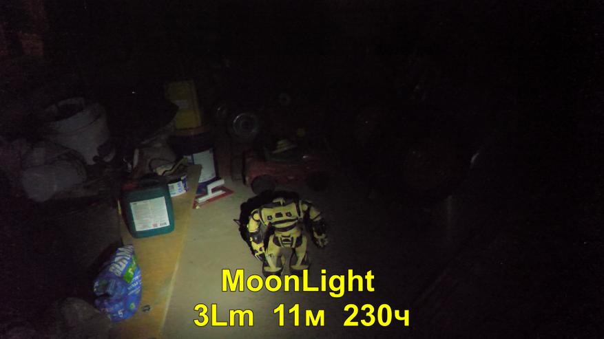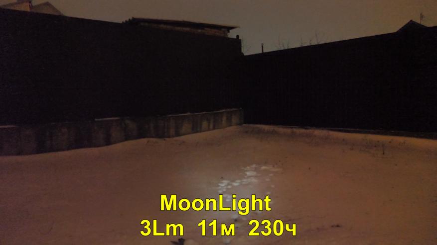 Что касается режима Moonlight, самого слабого режима свечения, его эффективность на открытой местности ограничена крайне короткими дистанциями — свет эффективен только непосредственно вблизи от фонаря.