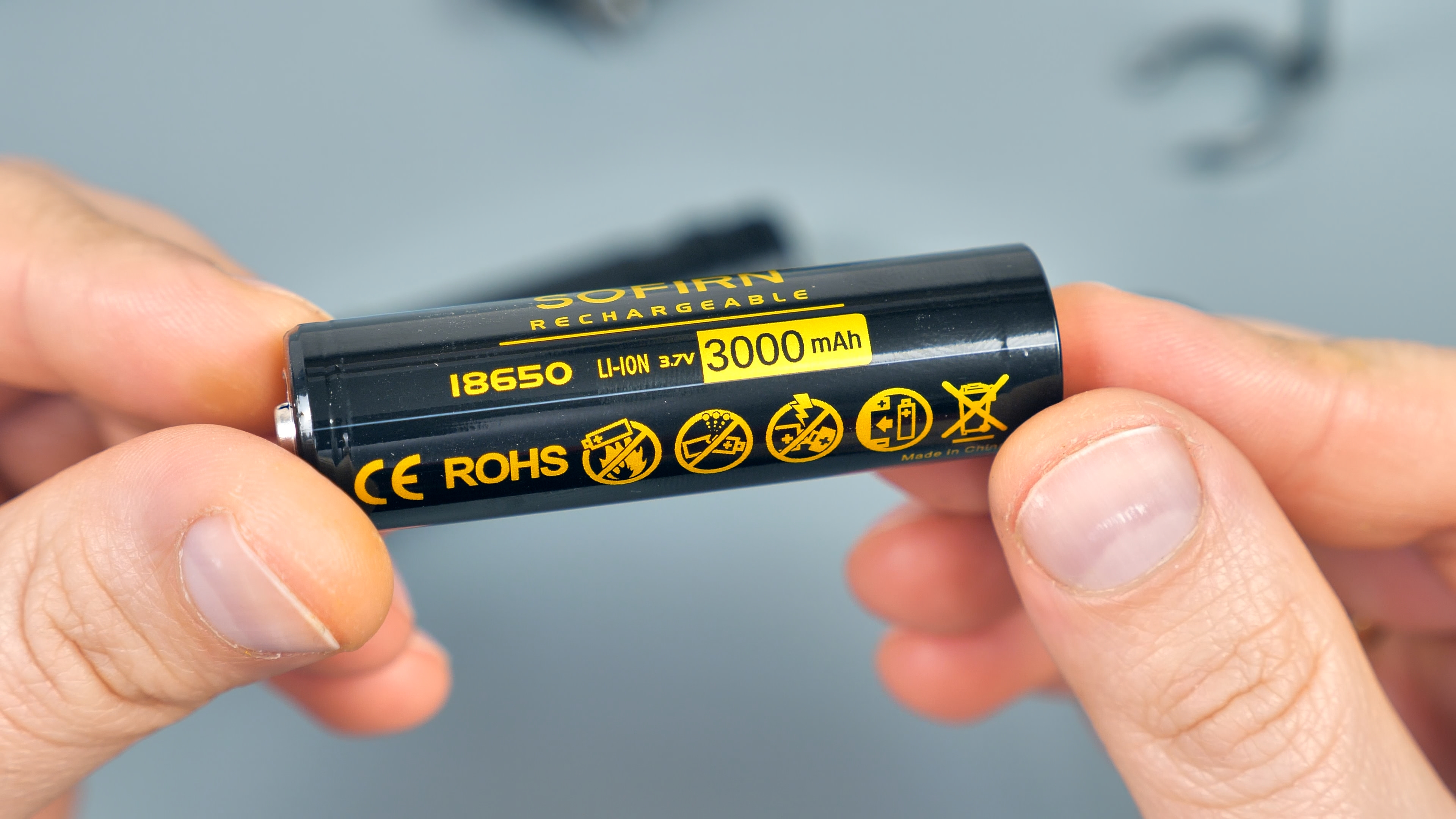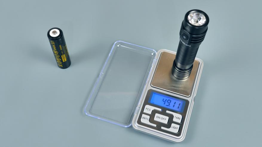 Комплектный аккумулятор фонаря — литий-ионный, брендированный, формата 18650, с заявленной ёмкостью 3000 мАч.