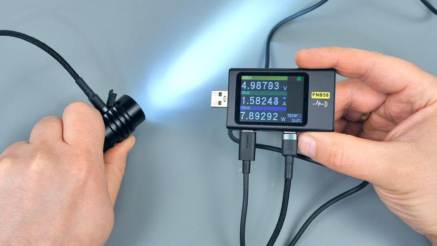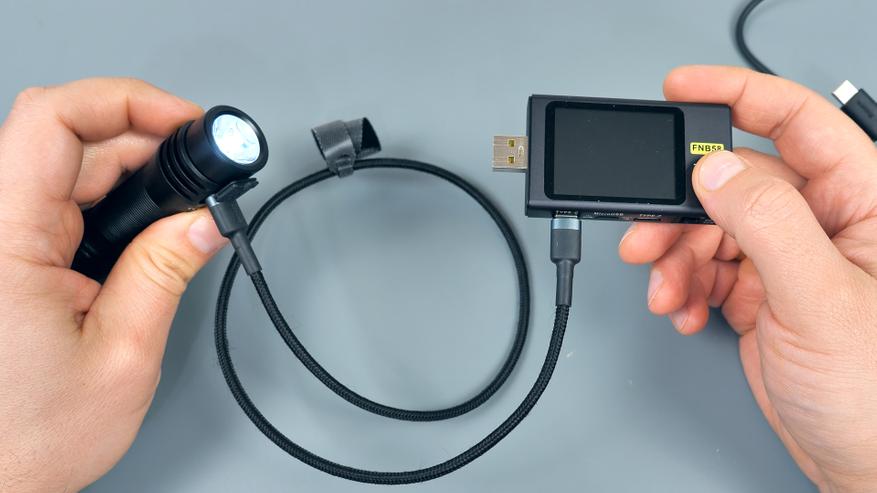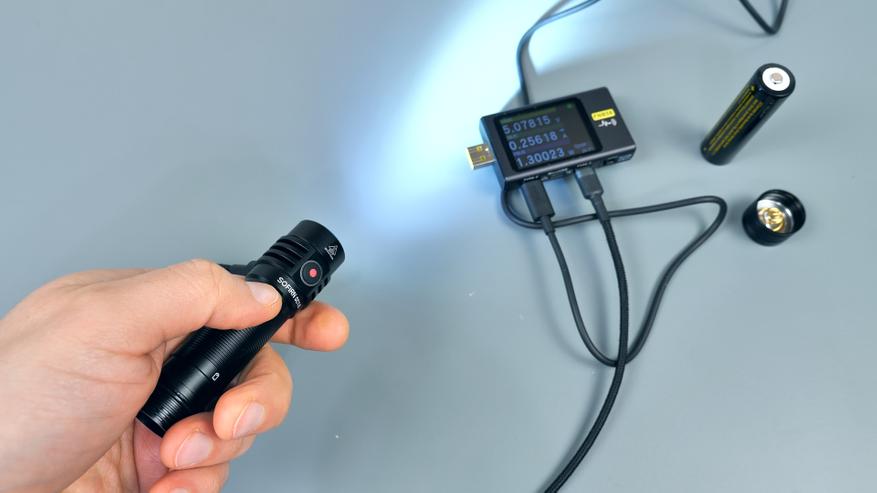 Зарядка аккумулятора фонаря осуществляется при мощности до 10 Вт и стандартном напряжении 5 В, что позволяет использовать любой USB-источник питания. Функция быстрой зарядки отсутствует. Полный цикл зарядки от 0 до 100% занимает приблизительно 2 часа.