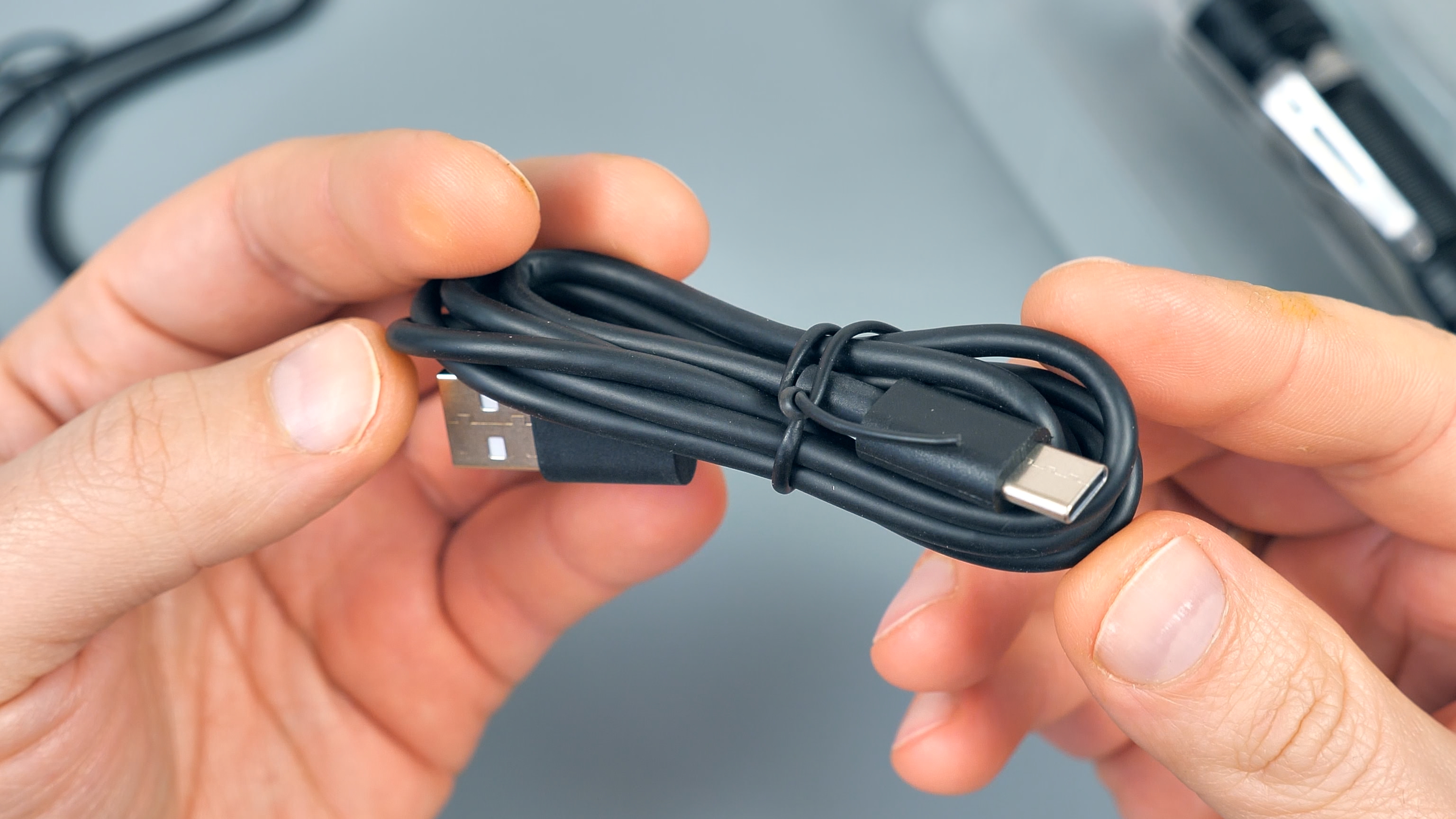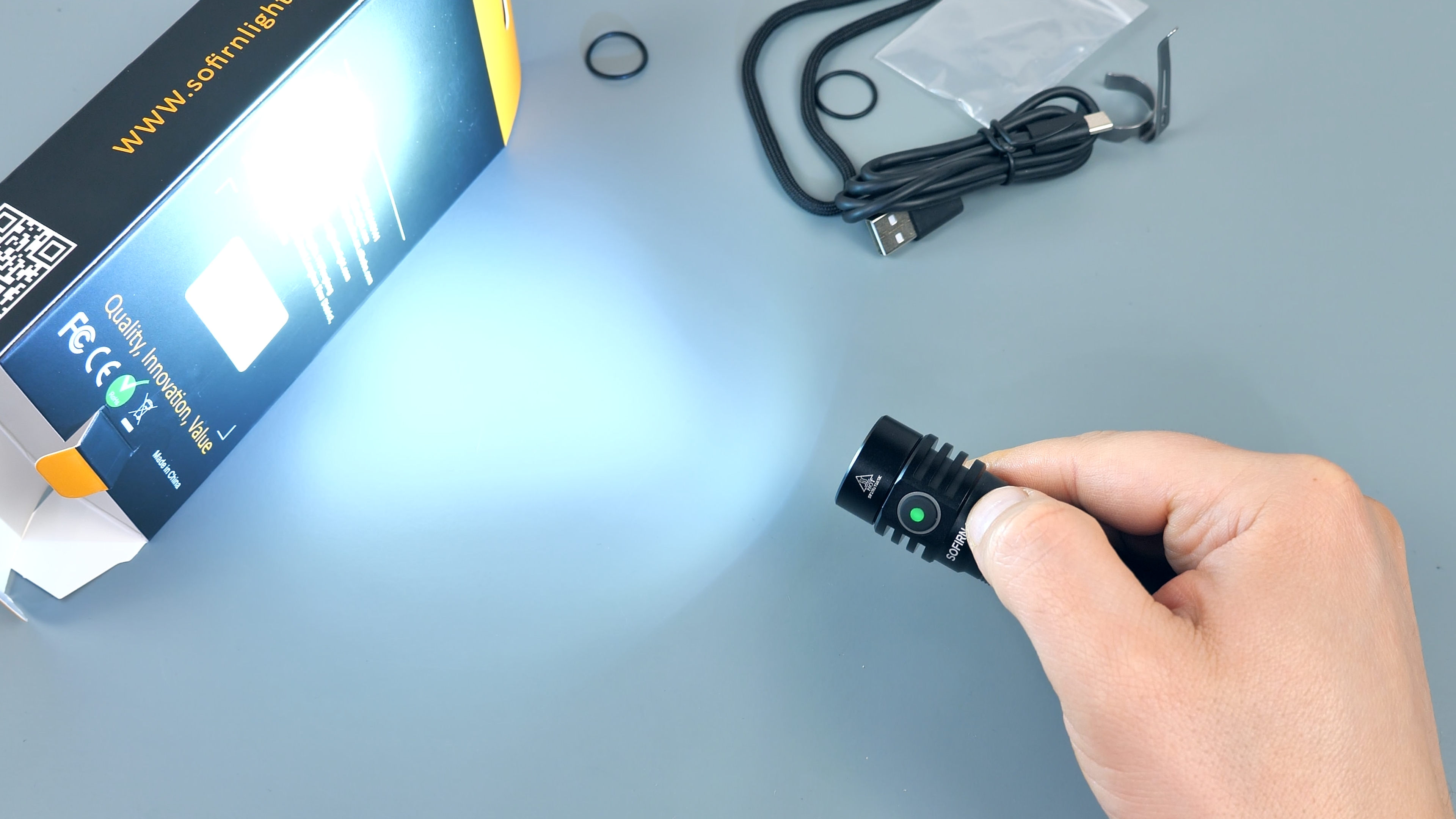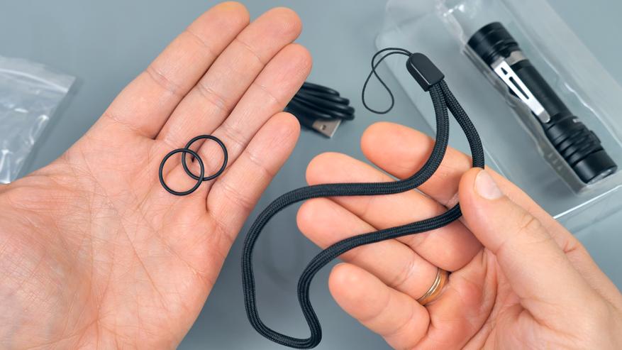 Также в комплекте есть темляк для удобной фиксации фонаря, например, на запястье, два запасных о-ринга (резиновых уплотнительных кольца) и метровый USB Type-C кабель для зарядки.
