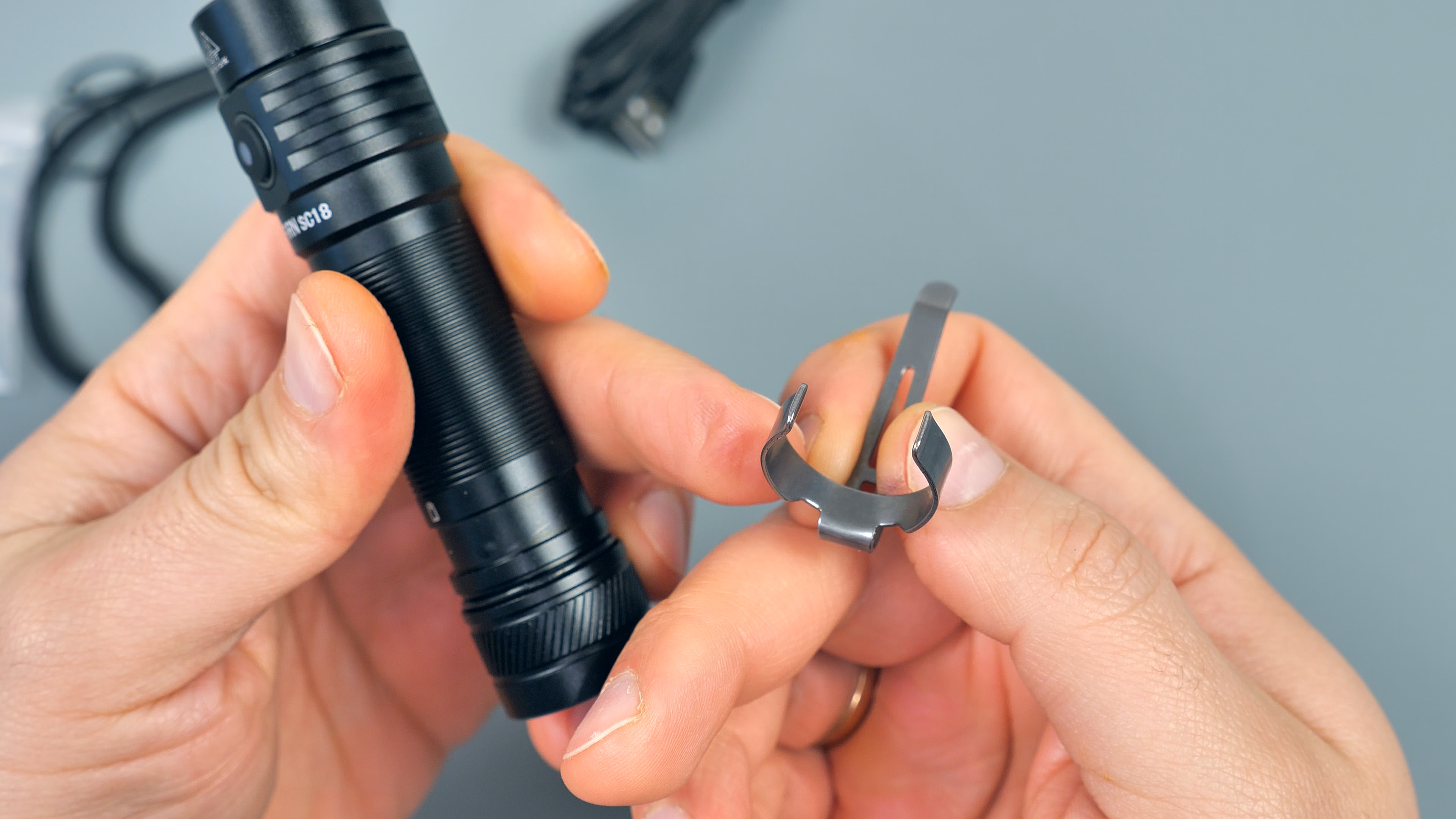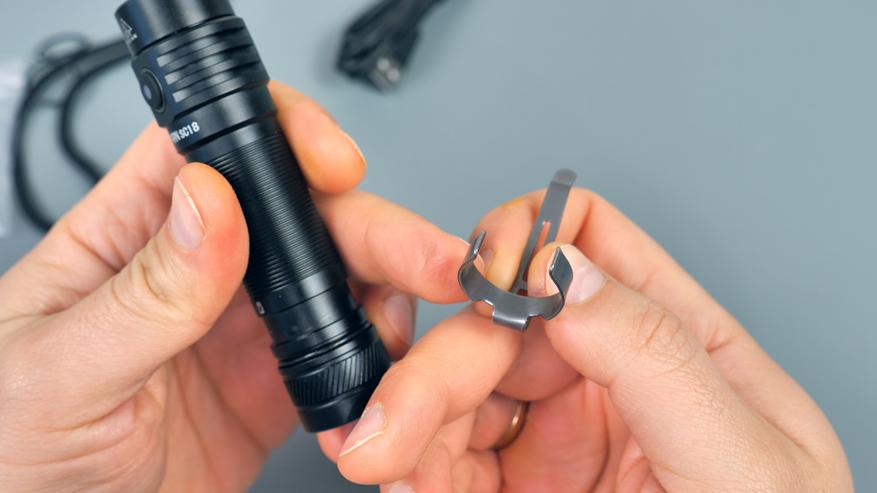 В комплекте также имеется металлическая клипса для фиксации фонаря на ремне или кармане. Она уже установлена на корпусе фонаря и при необходимости может быть снята. Снять её непросто — крепление очень надёжное, и фонарь не выпадет самопроизвольно даже при интенсивном использовании.
