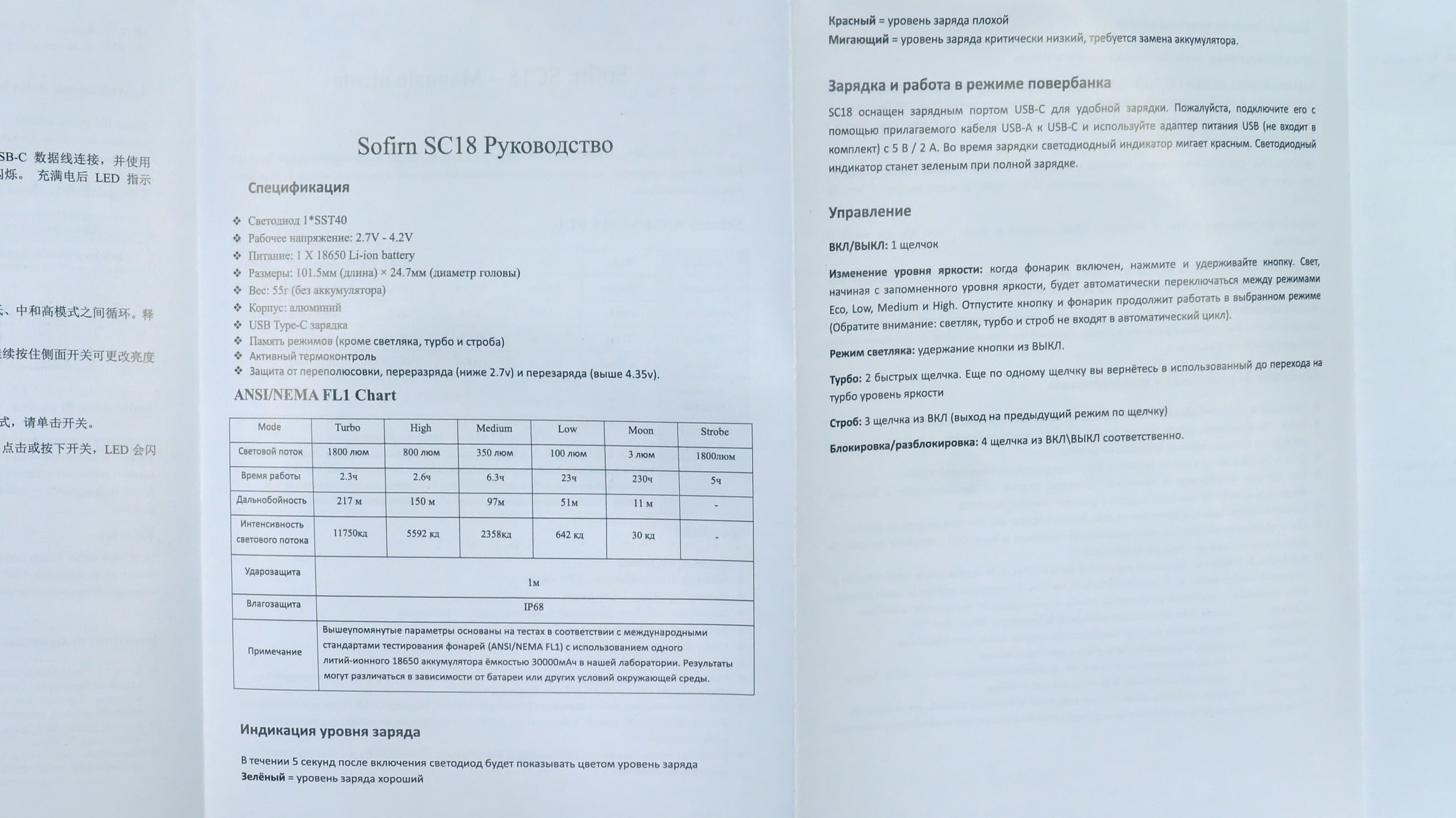 Фонарь имеет шесть режимов яркости свечения, а также полезную функцию блокировки кнопки, предотвращающую случайные нажатия. Степень защиты IP68 гарантирует полную защиту от пыли и возможность погружения под воду на глубину до 2 метров.