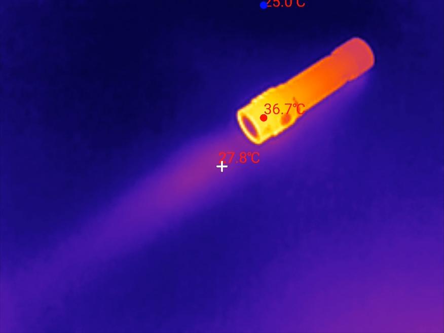 Однако на практике в Турбо-режиме фонарь способен работать около минуты, после чего температура его корпуса достигает примерно 40°C, и срабатывает термоконтроль. Данный механизм автоматически снижает яркость до уровня сильного режима, в котором фонарь продолжает функционировать. Термоконтроль необходим для предотвращения перегрева светодиода и его преждевременной деградации, учитывая высокую яркость фонаря и компактные размеры корпуса, выполняющего функцию теплоотвода.