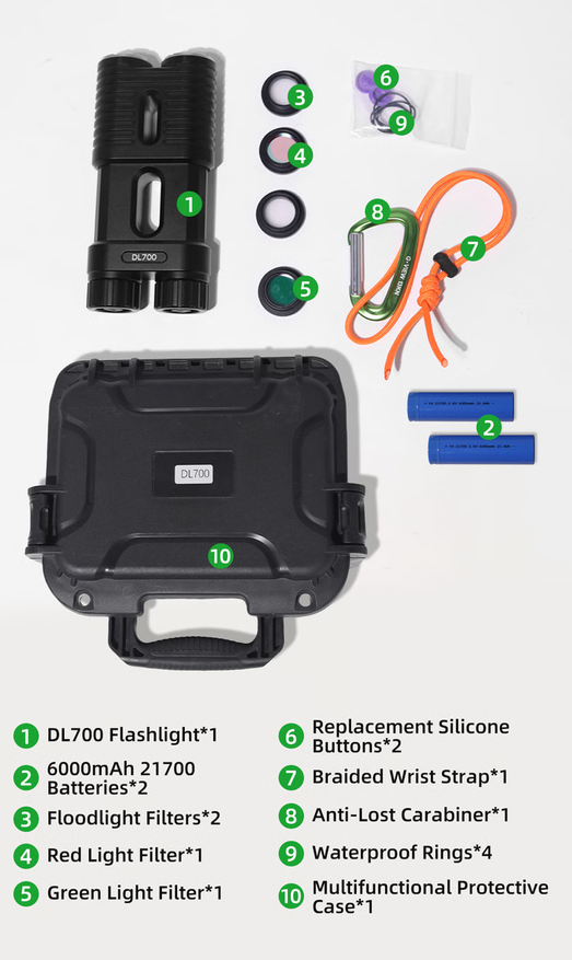 Стоимость DL700 для спонсоров краудфандинговового проекта от 329 долларов США. Дополнительная батарея 21700 + 15$. Отправка заказчикам намечена на декабрь этого года. В комплекте имеется: две батареи, темляк из нейлонового шнура с карабином, запасные резиновые кольца, четыре светофильтра на резьбе (красный, зеленый и два для рассеянного света).
