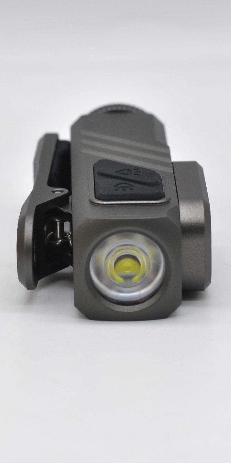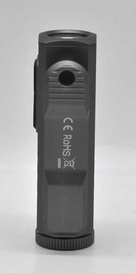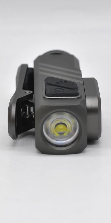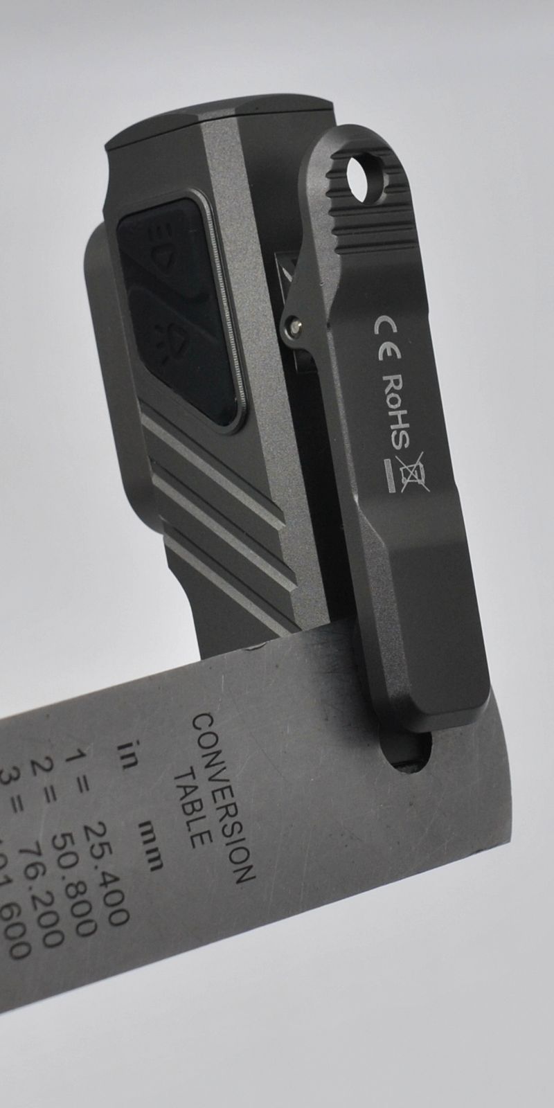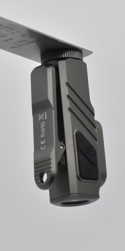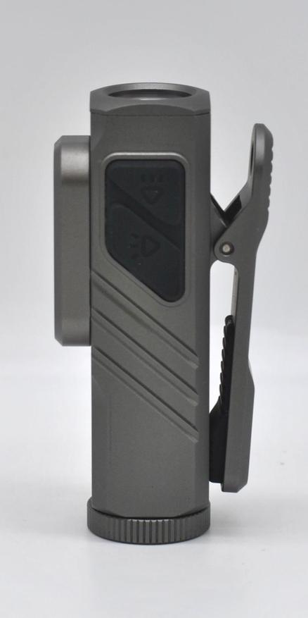 Фонарик компактный, ближайшее по размерам — это аккумулятор 21700 примерно (в ладони скроется полностью). Острые грани алюминиевого корпуса с фасками. Клипса (а-ля прищепка) шириной 14 мм, по жесткости примерно как бельевая прищепка, палец не сломает. Раскрывается на 1,5 см. Светодиодов всего три: в торце для фокусированного света, сбоку красный и flood-свет в TIR оптике (акриловая).