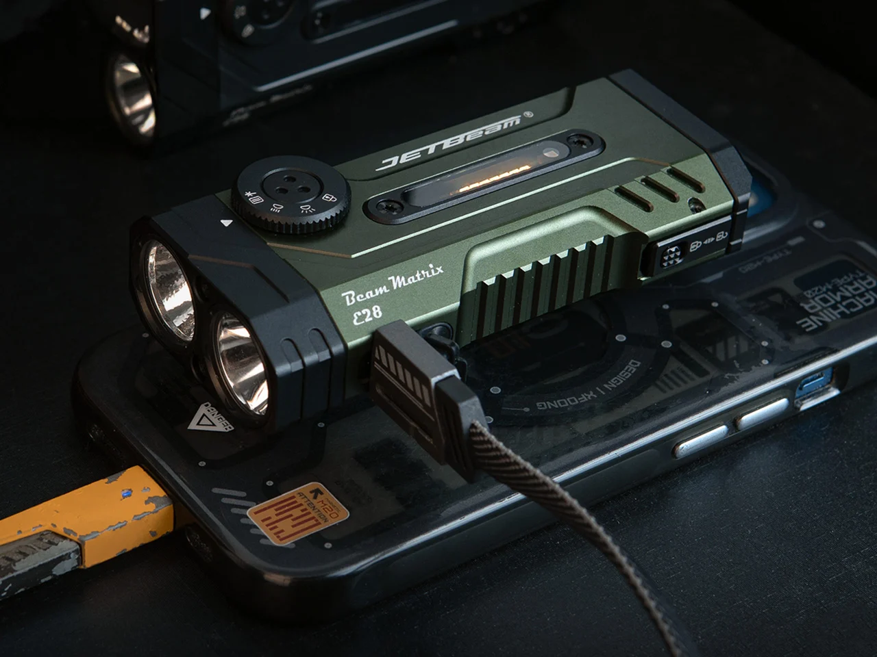 Производитель осветительного оборудования Jetbeam выпустил многофункциональный фонарь E28, который объединяет в одном корпусе два независимых белых светодиода, ультрафиолетовый излучатель, зелёный лазер и RGB-подсветку. Устройство заключено в алюминиевый корпус размером 107,6 x 48 x 26,6 мм и весит 251 грамм вместе с установленными батареями.