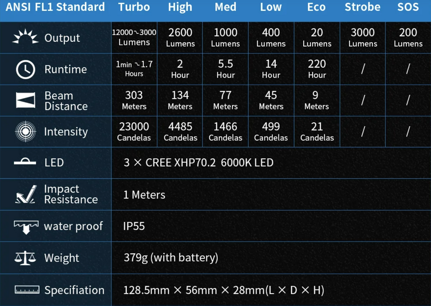 - Яркость и дальнобойность 12000 и 303м (23000Кд)