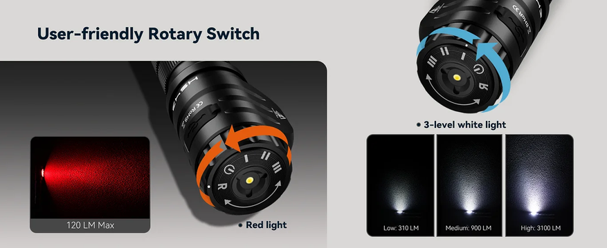 - Как и у вышедшего на днях супер-компактного налобного фонарика Lumintop L3 mini, в Sofirn HS43 нет кнопки и он управляется поворотным кольцом в торце у головы фонарика. Кольцо имеет 5 положений: три для трёх уровней яркостей белого света, одно для красного и разделяющее их положение ВЫКЛ.