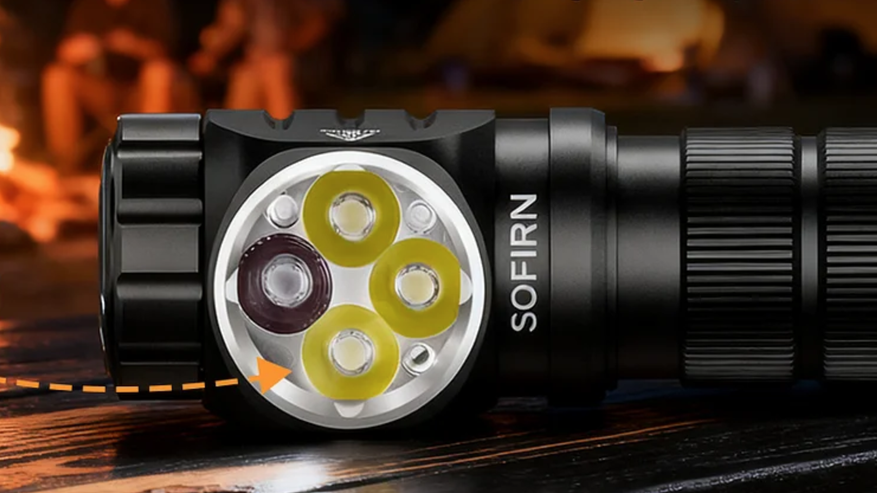 Sofirn HS43 получил находящийся за ТИР-линзами набор из светодиодов холодного белого и красного света: 3 штуки TN-3535 (6500-7000 К) для белого и один SST20R для красного света.