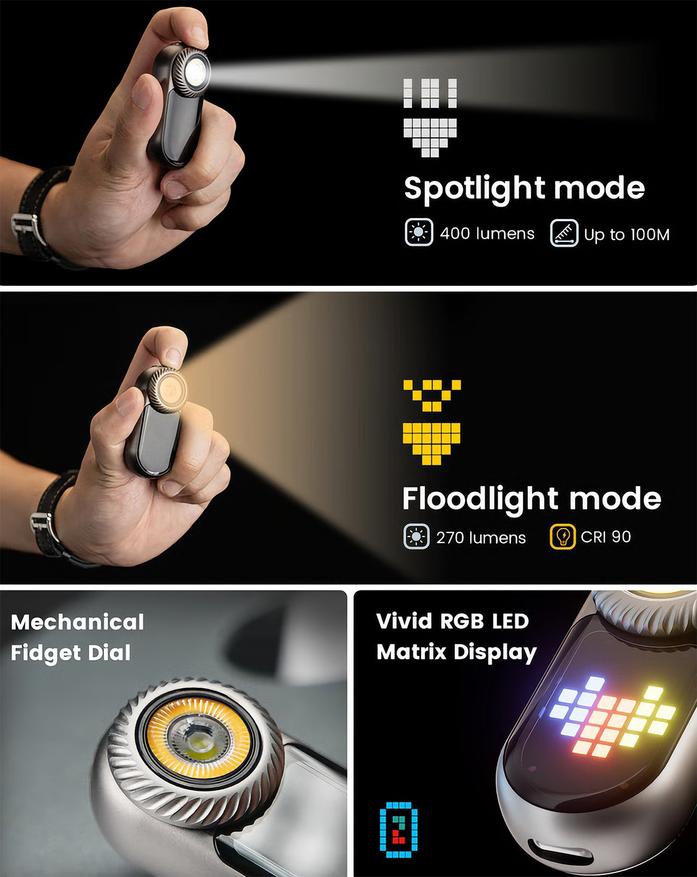 Компания LOOP GEAR анонсировала карманный фонарик LOOPDOT, объединивший функции освещения с пиксельным дисплеем и игровыми возможностями. Устройство оснащено механическим регулятором яркости и выпускается в корпусах из алюминия или титана.