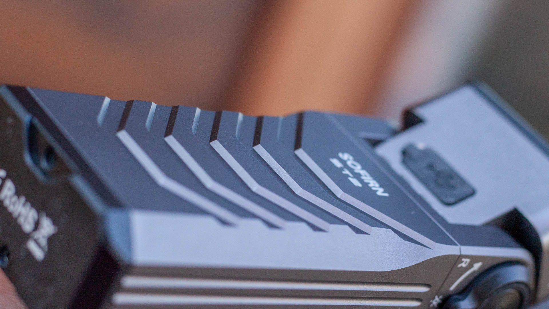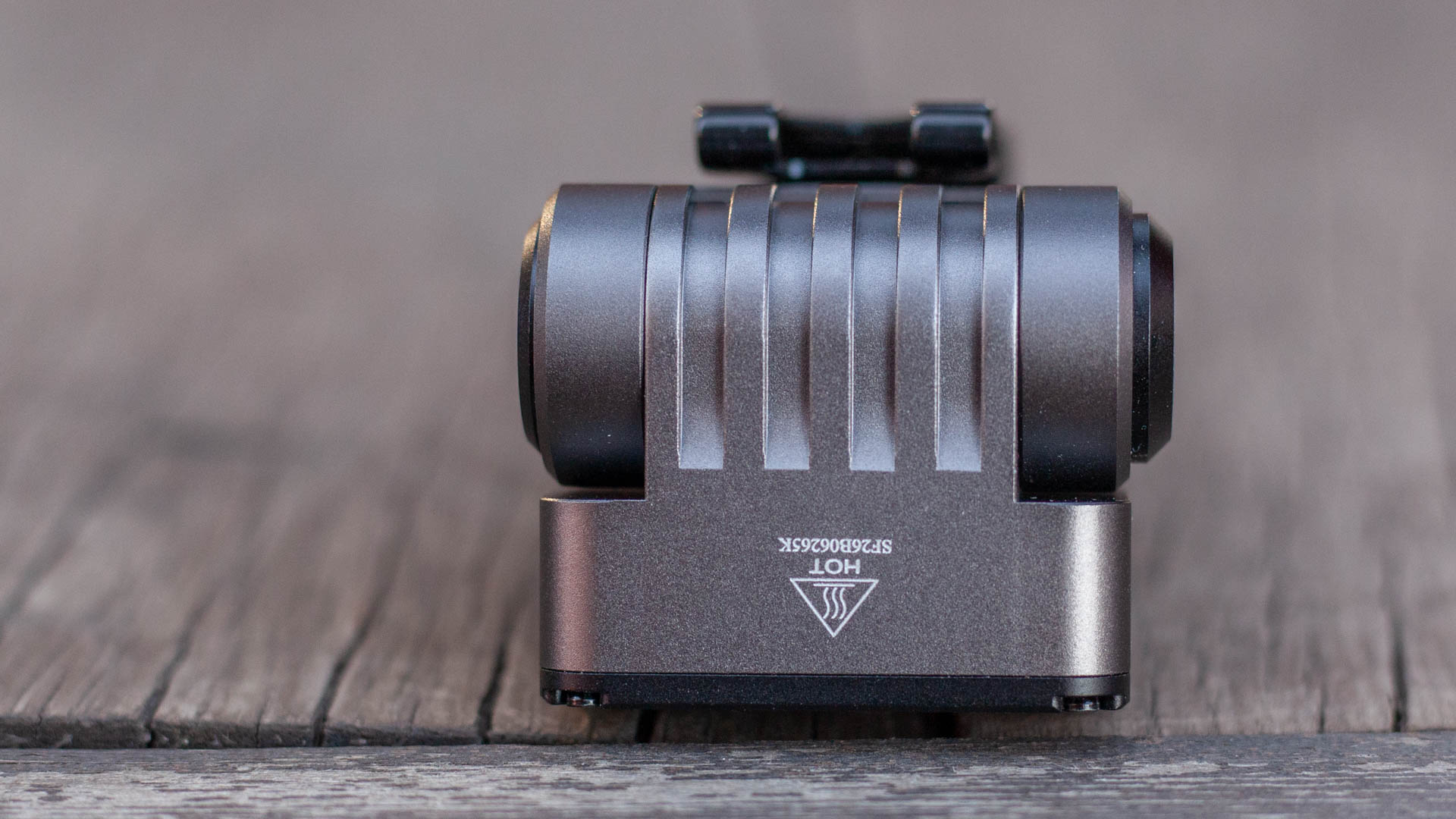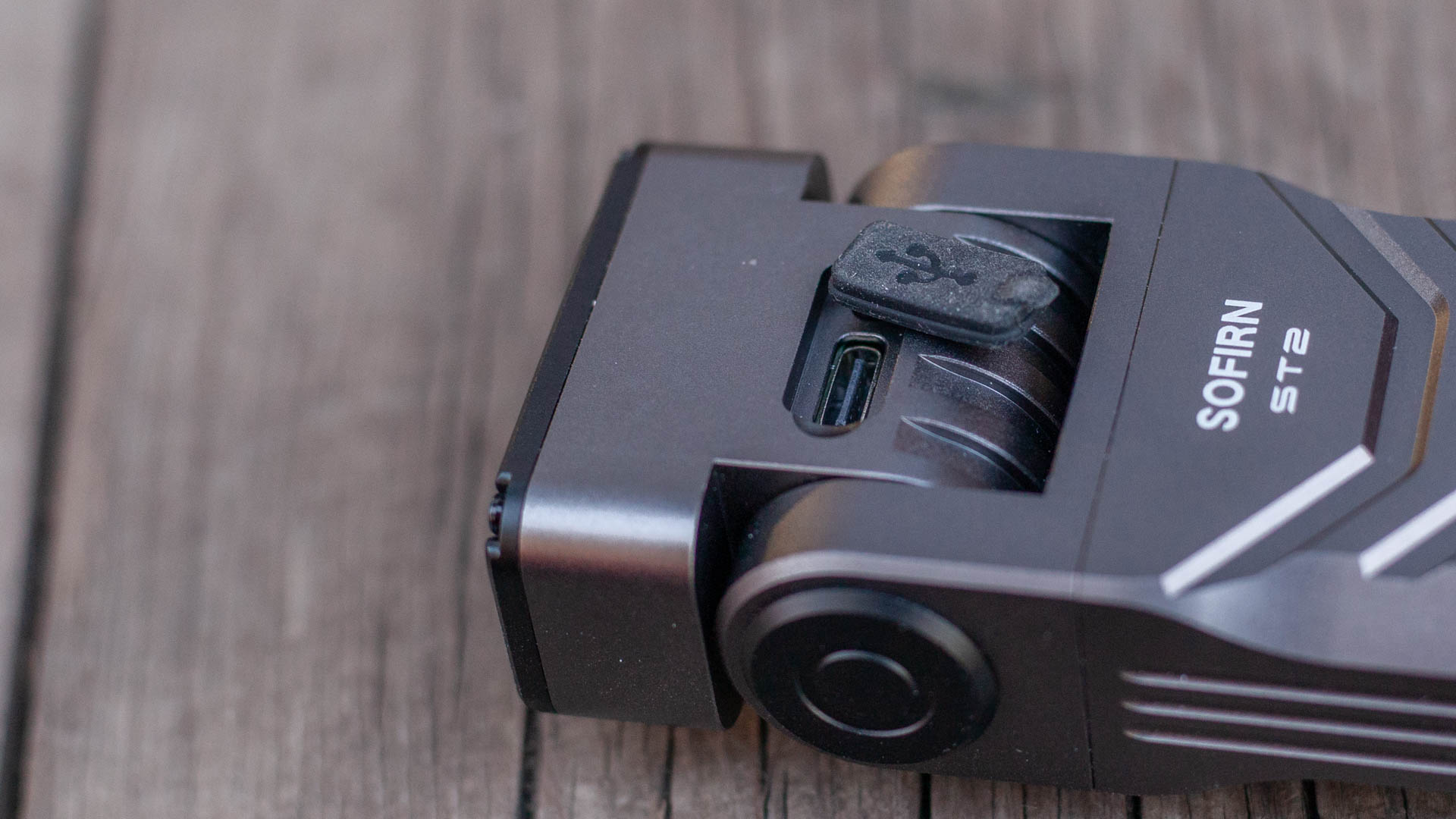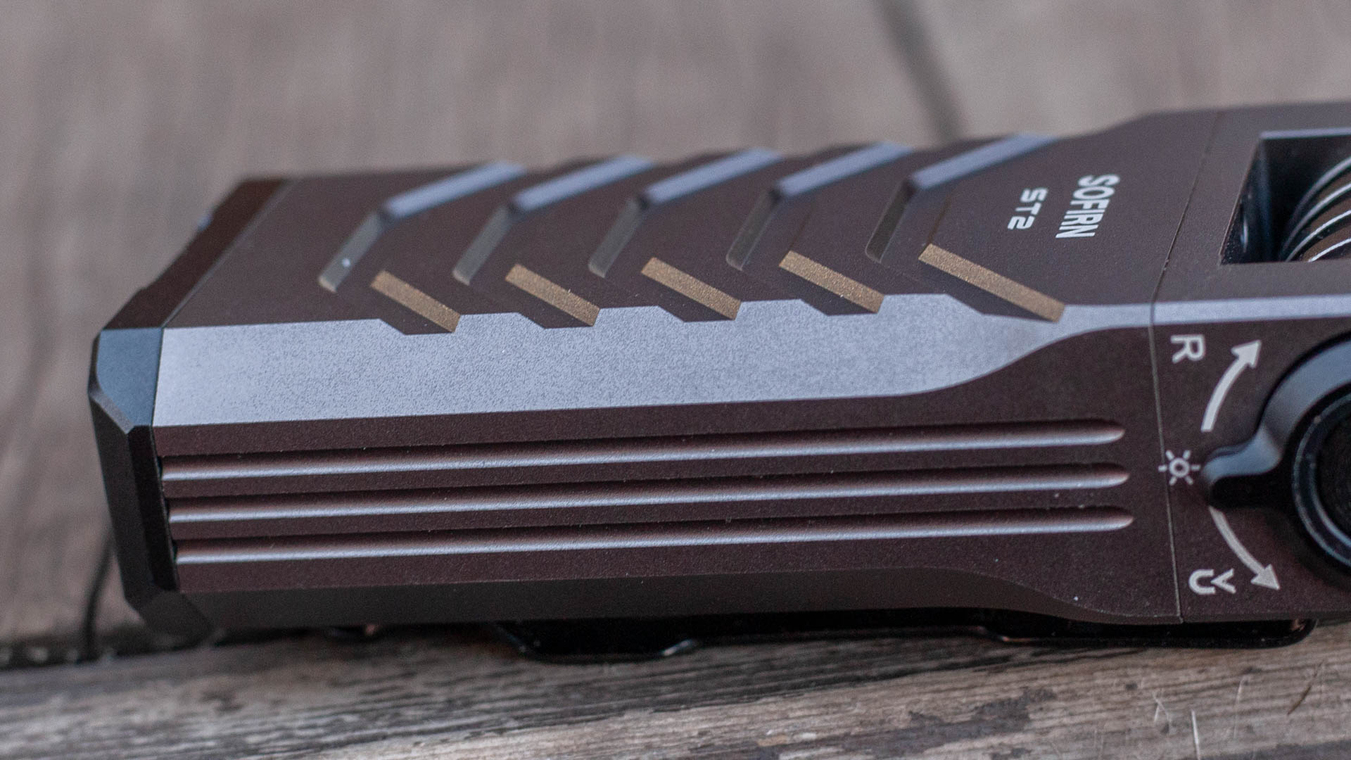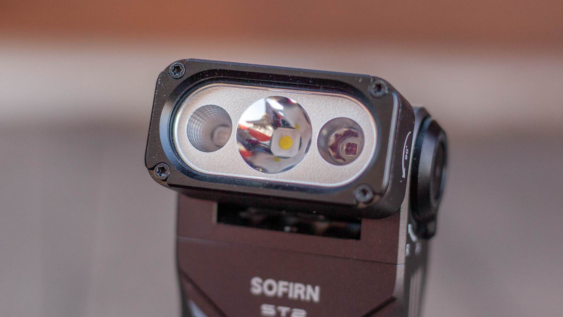 С противоположного от кнопки бока находится круглая черная металлическая заглушка, под которой, предположу находится подшипник. Подшипник в фонарике? Да! Ведь, как вы уже знаете, основная фишка Sofirn ST2 — наклонная голова. Чтобы наклонить её нужно приложить небольшое усилие, нет никакого ощущения, что голова сама «ныряет» вперёд и не будет держать заданный угол. Во время наклона голова делает негромки «тц-тц-тц», так что, судя по всему, внутри встроена трещотка. Звук приятный, в этом плане фонарик может выступать как новомодная фиджет-игрушка, занимая беспокойные пальцы. Голова наклоняется на 90 градусов и только вперед, о чем нам подсказывает еще и надпись на фонарике.
