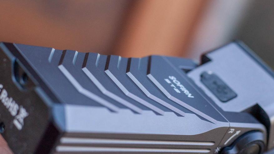 А вот и сам фонарик. Sofirn традиционно играют в бюджетной лиге (что не отменяет факта наличия у них фонариков значительно интереснее моделей от существенно более дорогих брендов), но ST2 и внешне, и конструктивно совсем из другой лиги. Справедливости ради, и стоит он больше привычного для Sofirn уровня. Итак, перед нами серо-стальной увесистый алюминиевый брусок. По длине ST2 вполне вписывается в EDC-стандарты, но выходит из них по ширине и весу — как-никак питается-то фонарик от двух 18650 аккумуляторов.