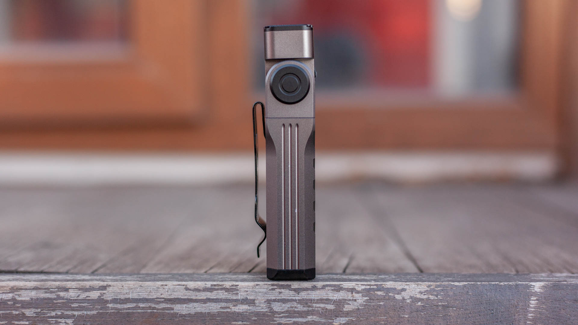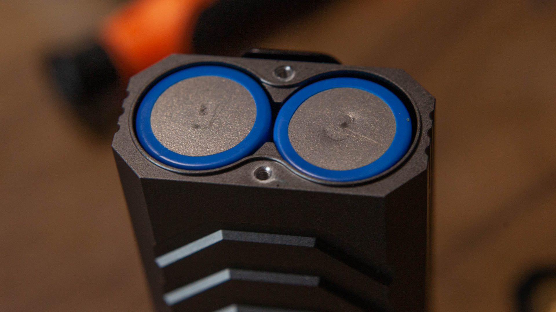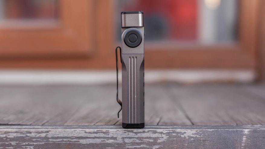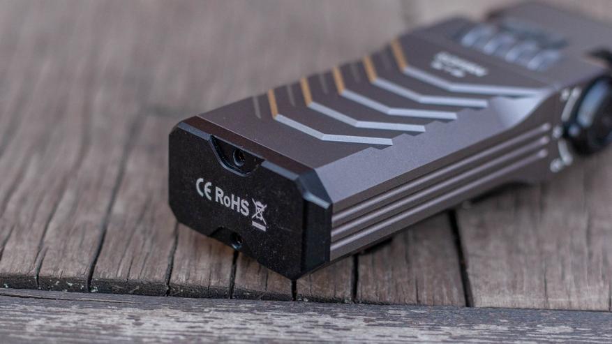 Кнопка чуть утоплена вглубь тумблера, чтобы не включить фонарик, если тот случайно прижмется к чему-то боком. Мелкая концентрическая резьба на кнопке выглядит скорее данью дизайна чем чем-то практичным, я просто не вижу варианта как палец может не попасть на неё. Ход кнопки достаточно тугой и неглубокий. В центре кнопки, ожидаемо, находится красно-зелёный индикатор уровня заряда.