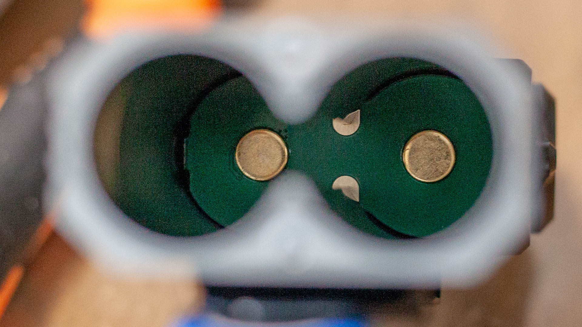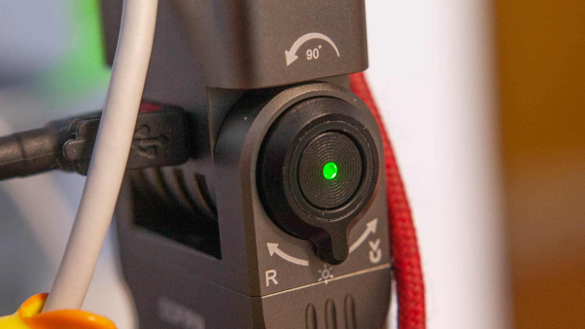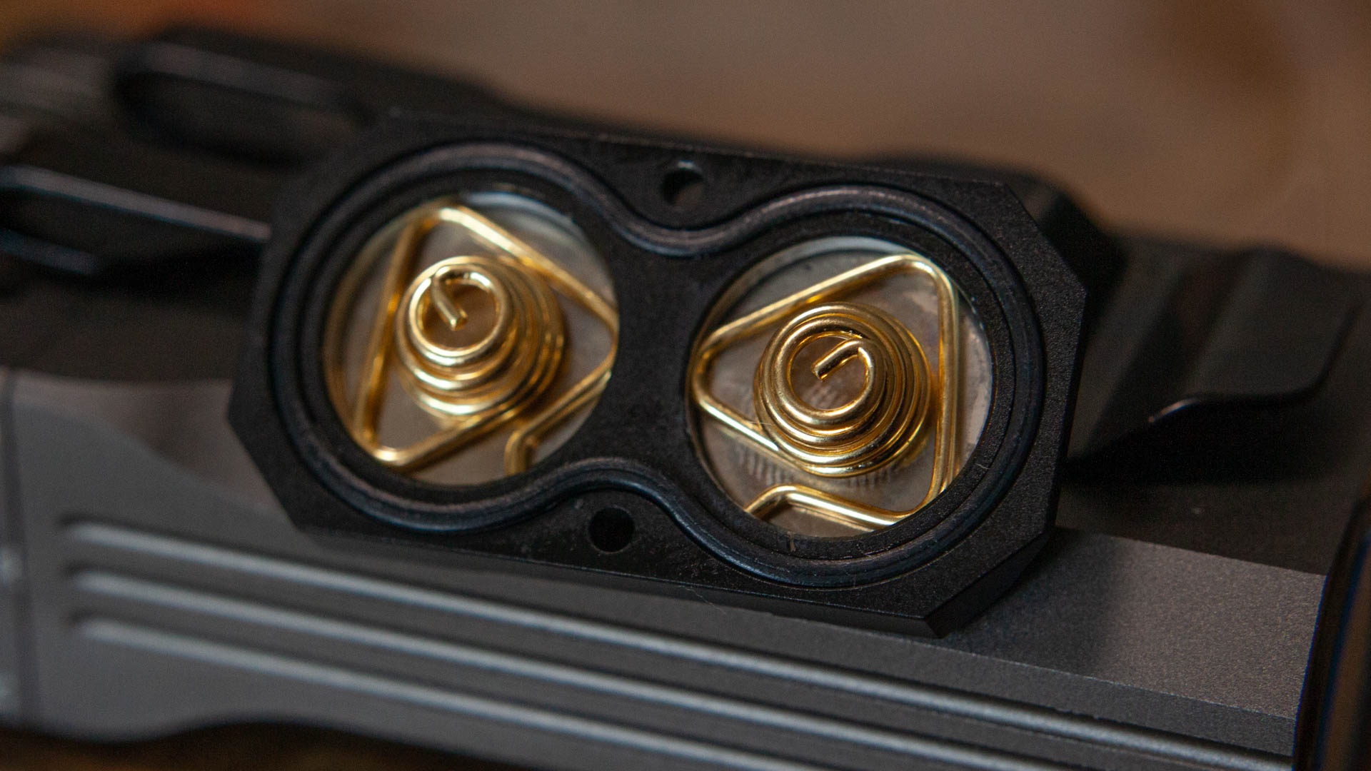 Кнопка чуть утоплена вглубь тумблера, чтобы не включить фонарик, если тот случайно прижмется к чему-то боком. Мелкая концентрическая резьба на кнопке выглядит скорее данью дизайна чем чем-то практичным, я просто не вижу варианта как палец может не попасть на неё. Ход кнопки достаточно тугой и неглубокий. В центре кнопки, ожидаемо, находится красно-зелёный индикатор уровня заряда.