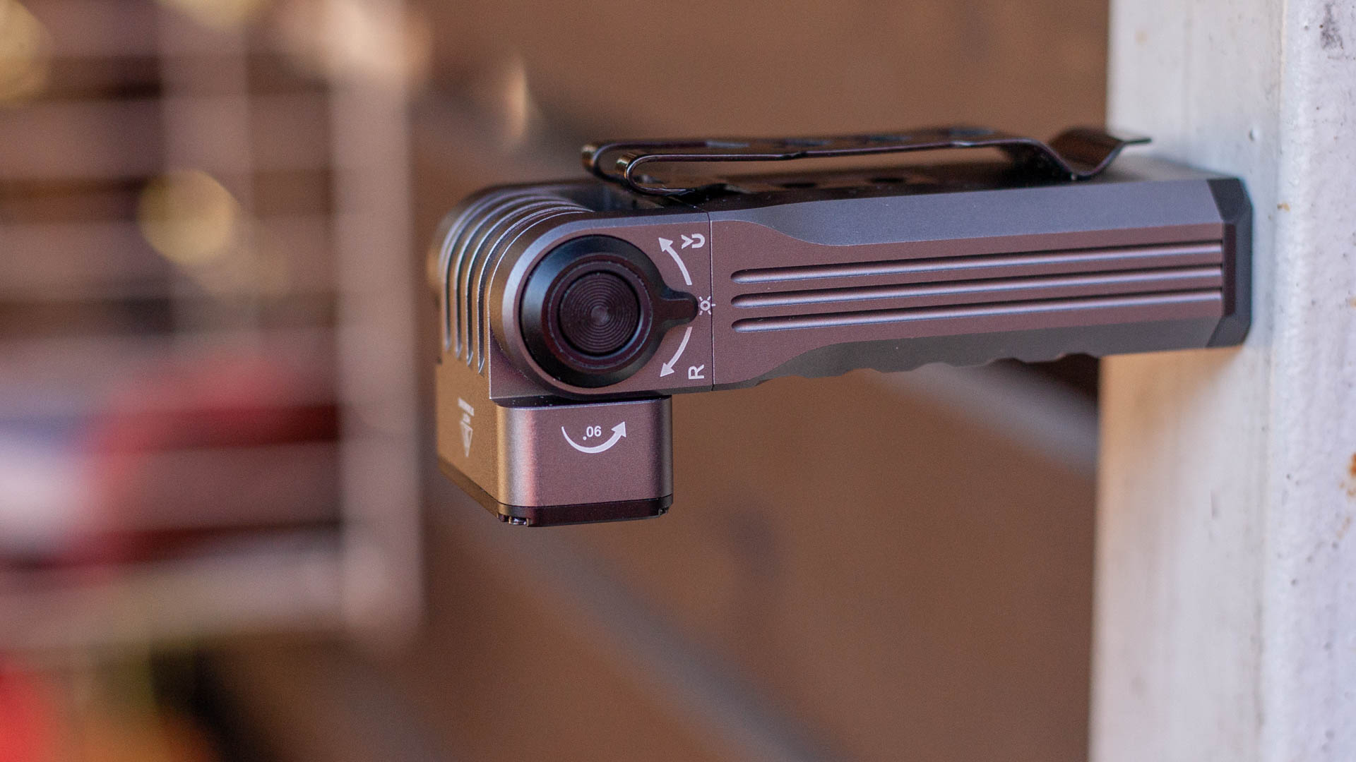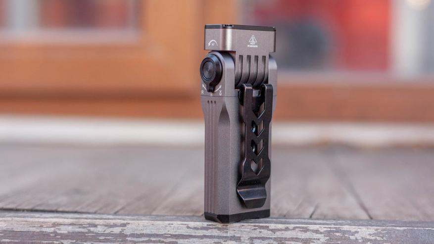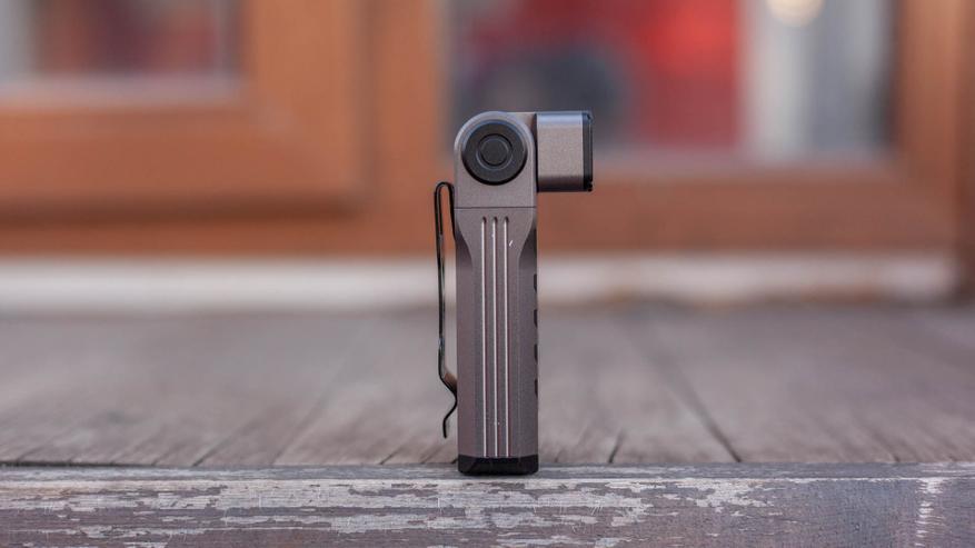 Зато такая квадратичность дает надёжный хват, фонарик сидит в руке несомненно удобно. Все грани у фонарика, включая «стремительную» глубокую V-образную накатку предусмотрительно скошены, ничто не впивается в руку, в том числе и широкая клипса на задней стороне корпуса. При желании клипсу можно снять. Токарка безупречная.