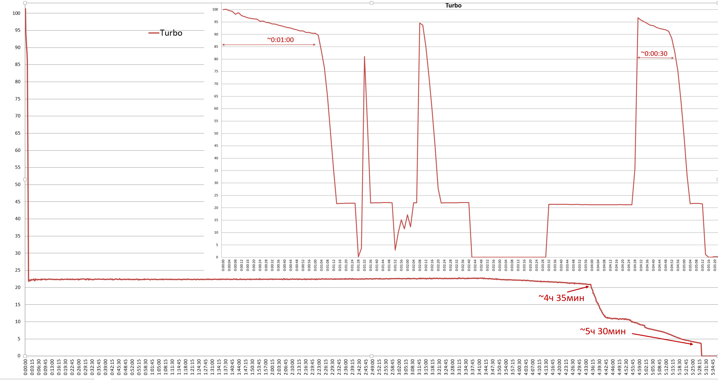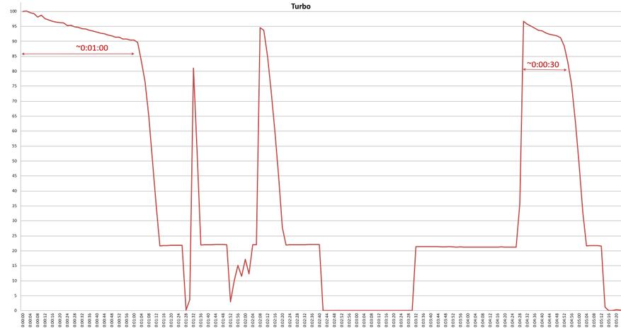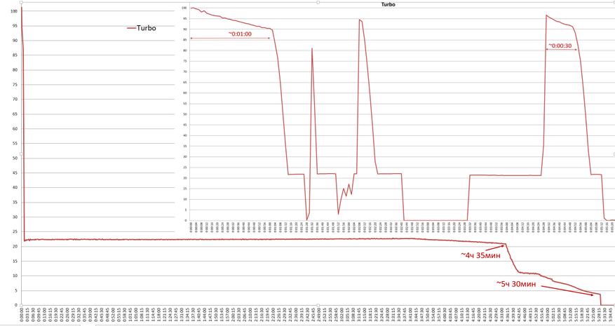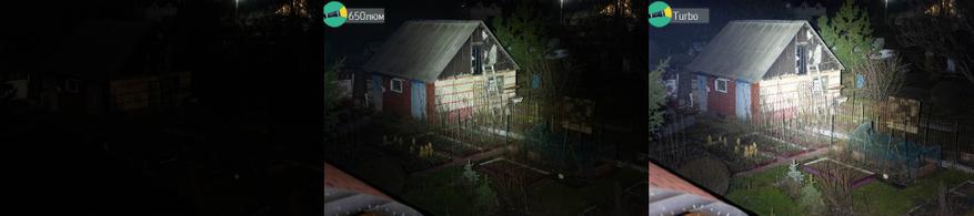 При такой яркости и конструкции, где возможность наклонить голову оборачиваться уменьшением теплопереноса на остальной корпус, логично что фонарик может более-менее держать заявленное турбо только из холодного старта. И все же, если запустить турбо не сразу повторно, а из того уже стабильного для фонарика уровня 650люм, получается 30 секунд достаточно близкой к турбо-уровню яркости. Неожиданно и неплохо.