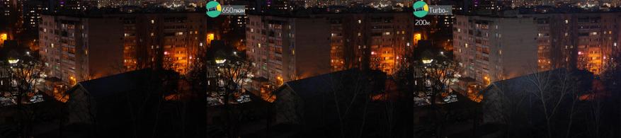 Кстати, если присмотритесь внимательно, то увидите что какой-то свет на 200м есть даже не уровне в 650люм. Неяркий, да, но есть. В полной темноте, контраст был бы определённо более наглядным. И это отличный результат для такого крохотного рефлектора. Думаю что в замкнутом пространстве типа пещеры ST2 показал бы себя неплохо.