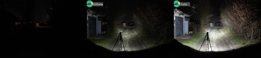 В обычных обстоятельствах 650 люменов была бы яркостью явно не выдающейся для фонарика с таким обилием металла в корпусе. Будь тот сплошным, то, уверен, фонарик вполне держал бы привычную тысячу люменов. Но, увы, как писал выше — тепло-то с головы надо отводить и при такой конструкции это непросто. Так что 650 люменов сейчас видятся мне вполне приличным уровнем. Тем более что вживую это вполне достаточно для того, чтобы достать за пол-сотни метров или осветить путь впереди.