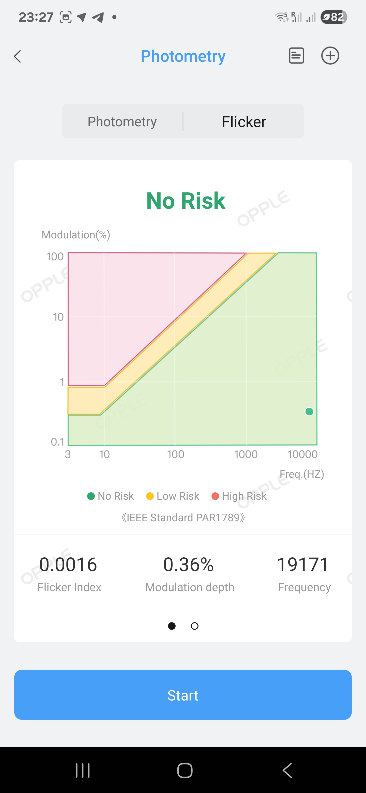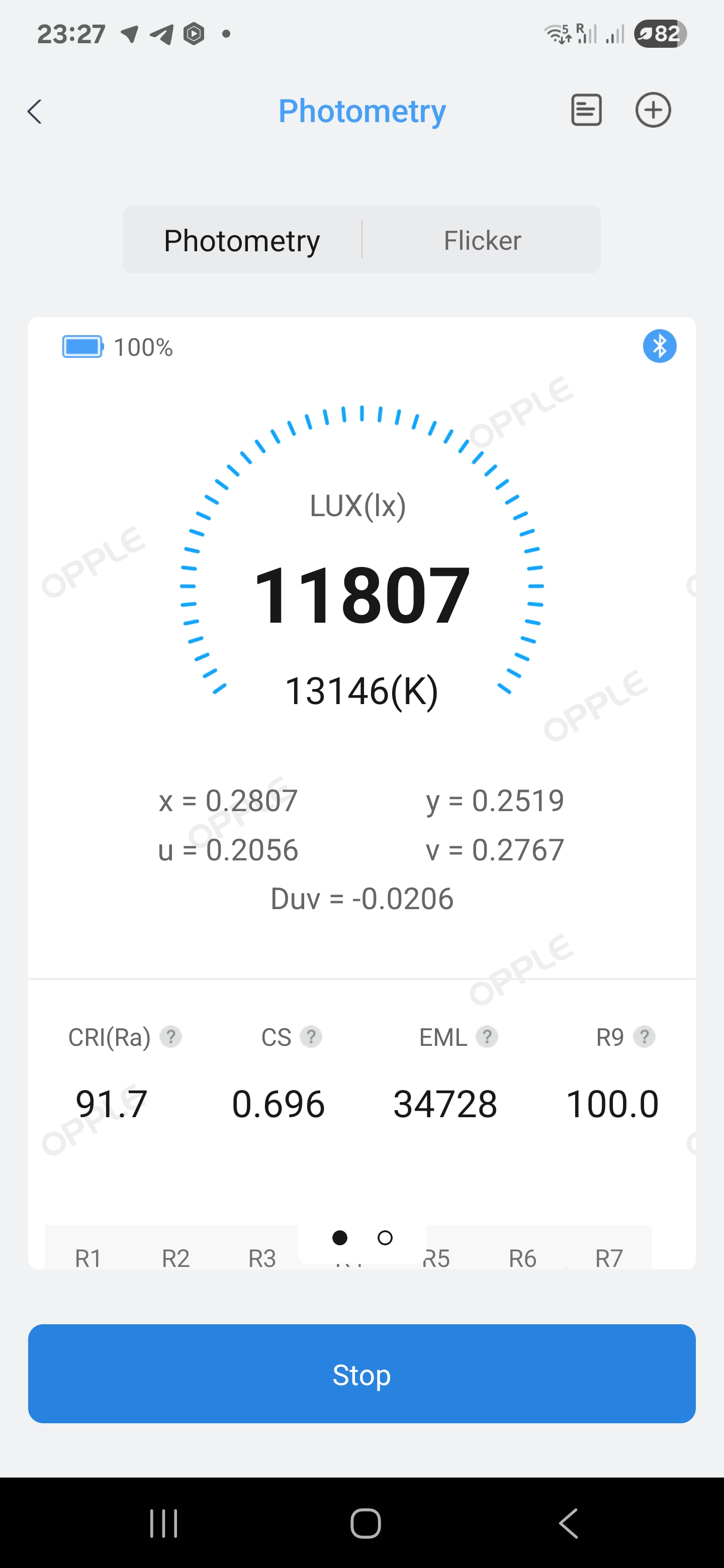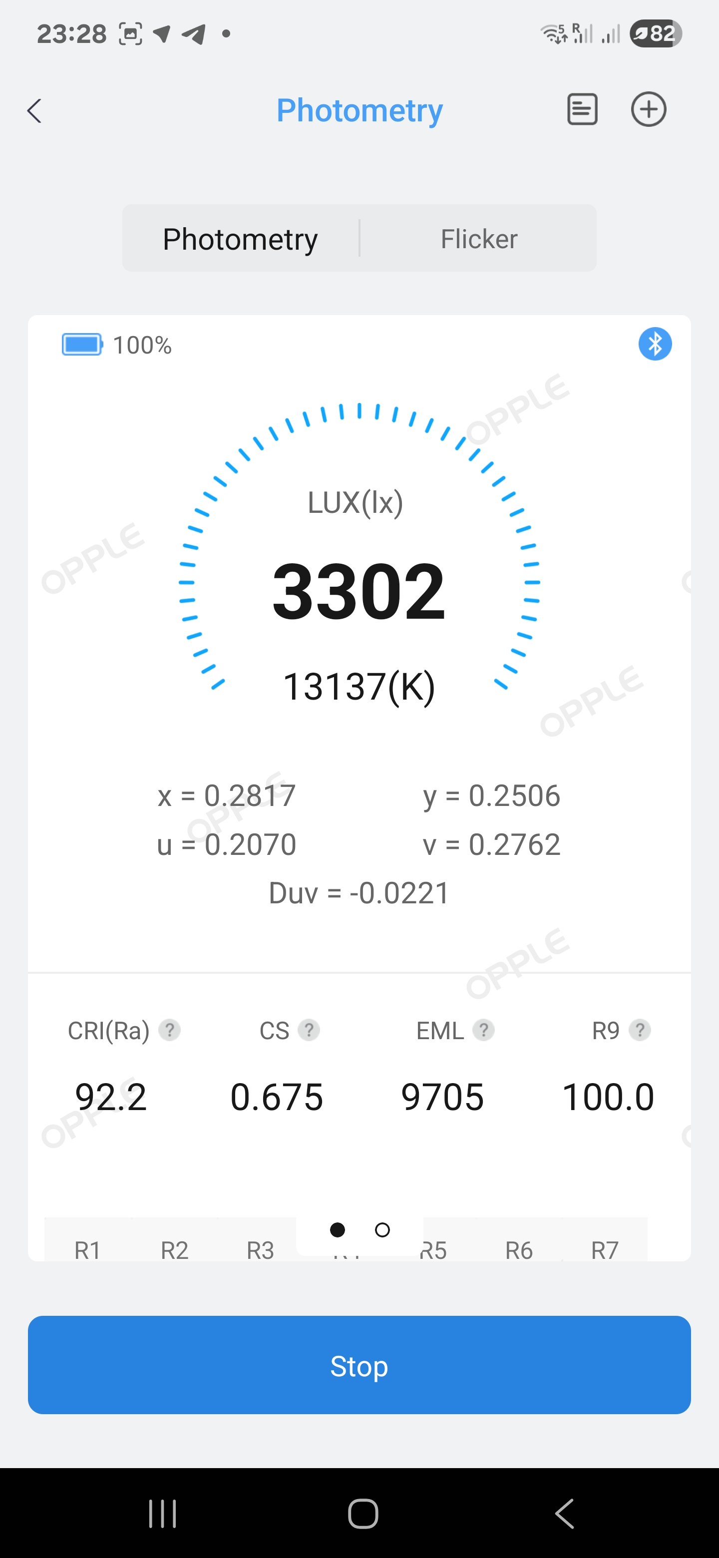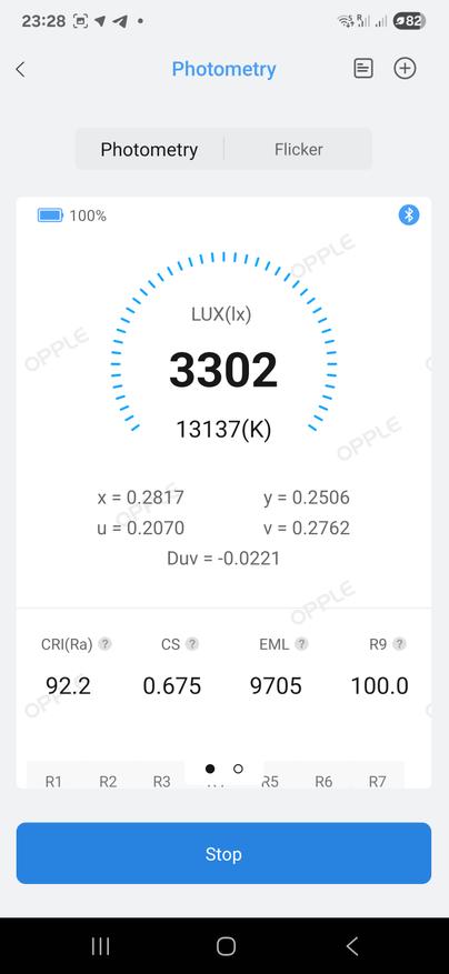 Когда перешел в режим минимальной яркости, освещенность упала до 3302 лк, цветовая температура почти не изменилась и составила 13137 К. Индекс цветопередачи даже немного вырос до 92.2, при этом R9 снова остался на уровне 100. Картина распределения похожа на результаты при максимальной яркости, слабым местом снова выступает R12. А вот по части стабильности работы ситуация иная — глубина модуляции подскочила до 99.5 %, а индекс фликера составил 0.745. Частота в районе 300 Гц, и прибор определил этот режим как высокий риск по мерцанию. Световой поток работает с сильными пульсациями.