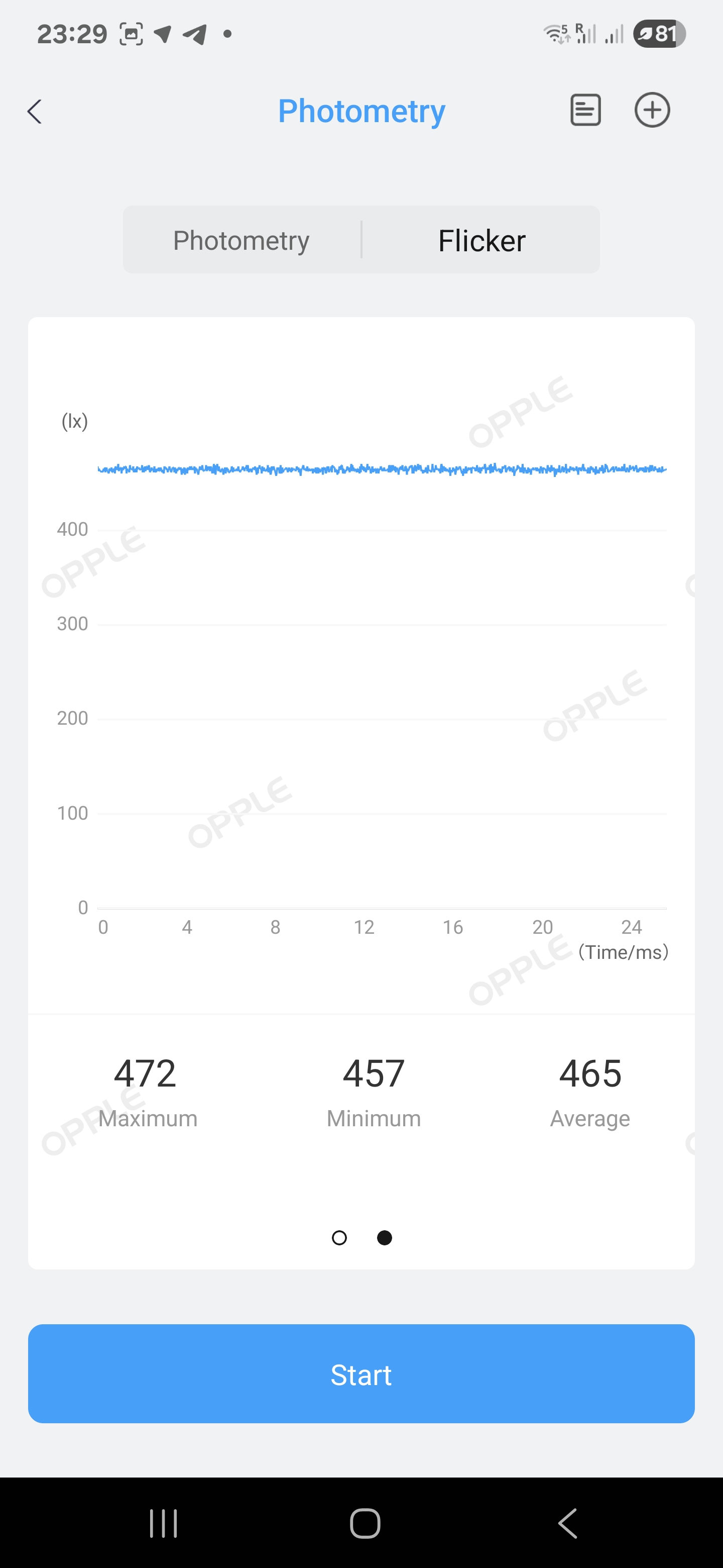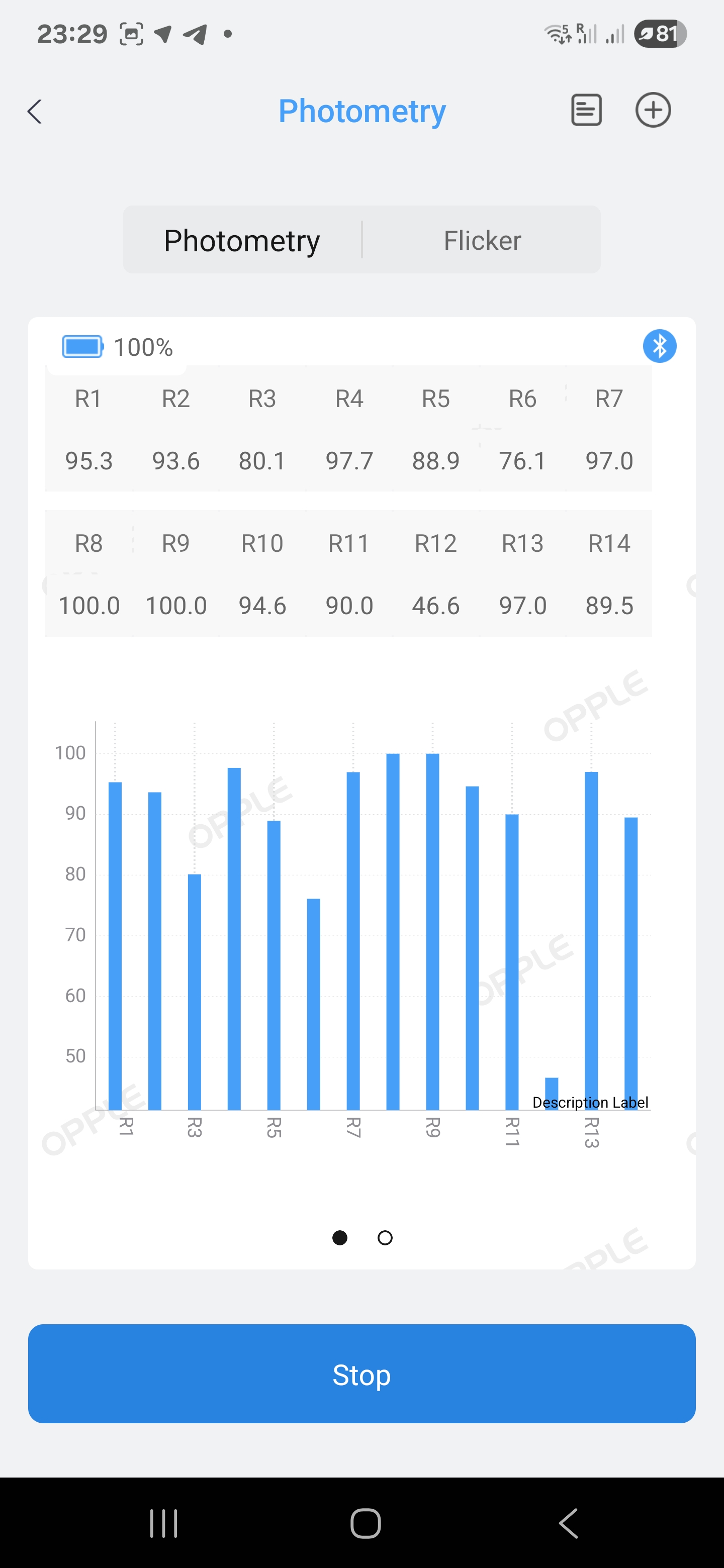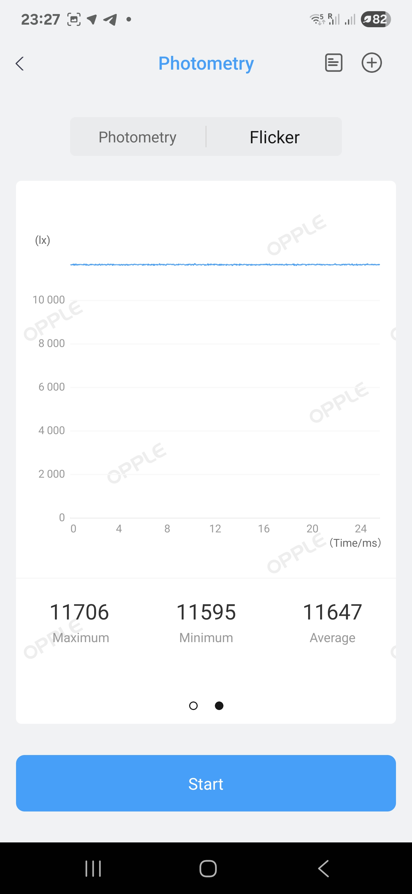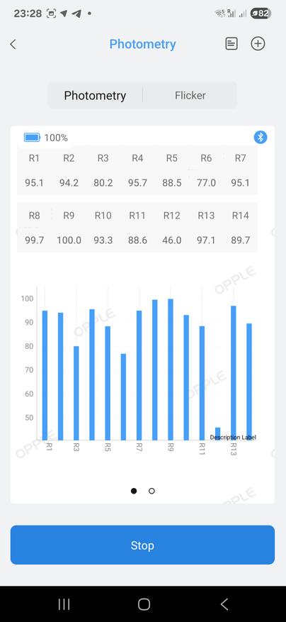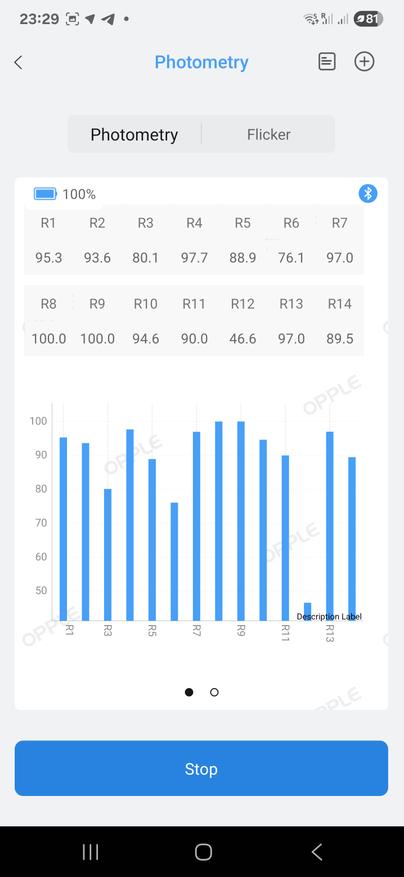 Когда перешел в режим минимальной яркости, освещенность упала до 3302 лк, цветовая температура почти не изменилась и составила 13137 К. Индекс цветопередачи даже немного вырос до 92.2, при этом R9 снова остался на уровне 100. Картина распределения похожа на результаты при максимальной яркости, слабым местом снова выступает R12. А вот по части стабильности работы ситуация иная — глубина модуляции подскочила до 99.5 %, а индекс фликера составил 0.745. Частота в районе 300 Гц, и прибор определил этот режим как высокий риск по мерцанию. Световой поток работает с сильными пульсациями.