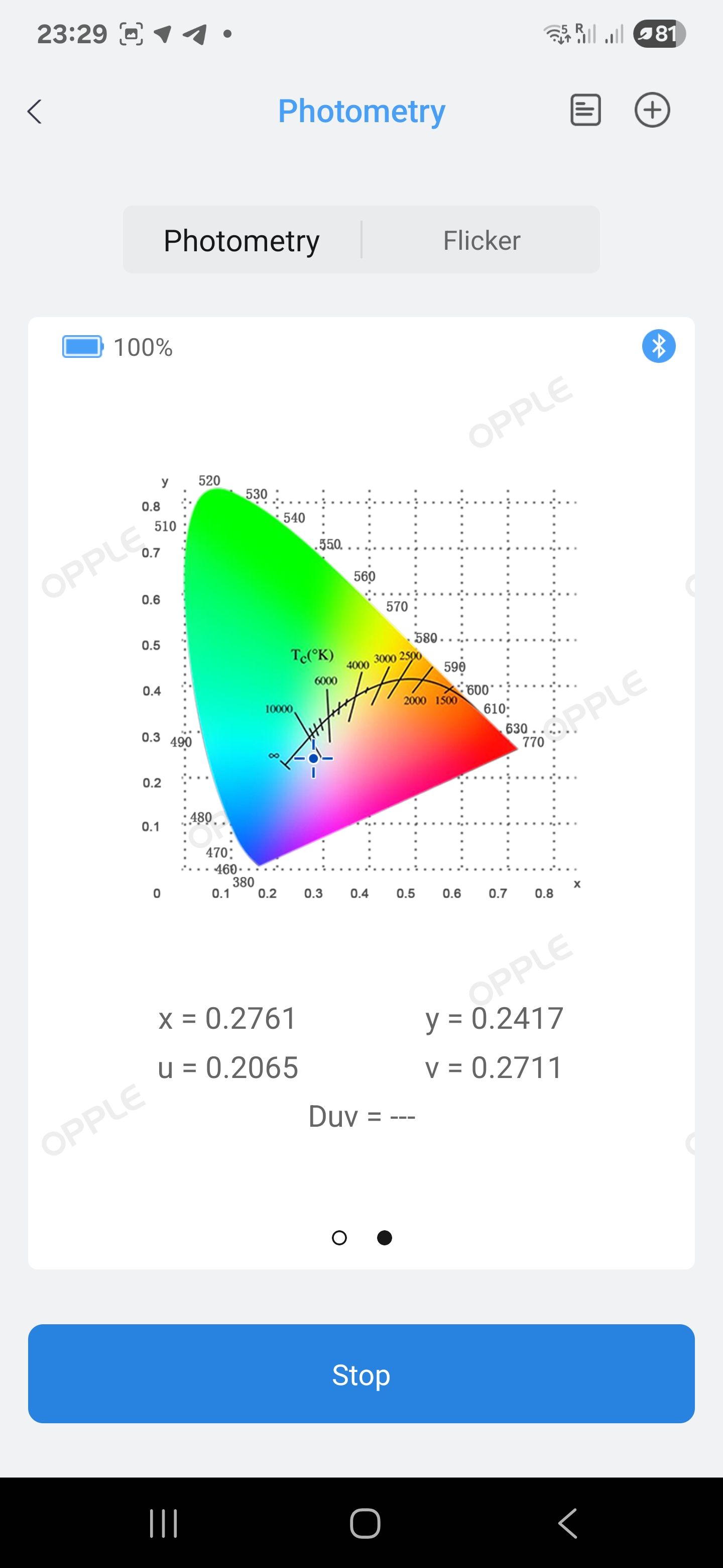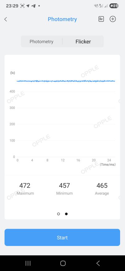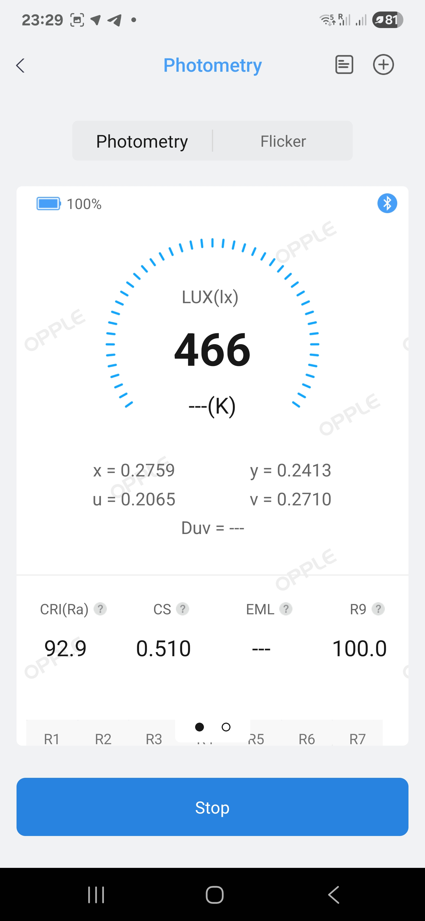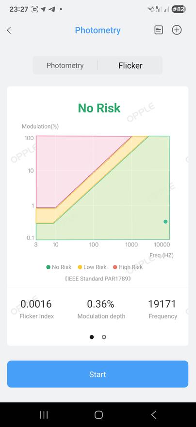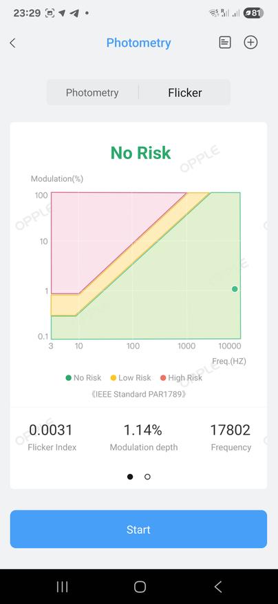 В режиме широкого пятна при максимальной яркости освещенность составила 466 лк. Цветовая температура на этот раз не отобразилась, но координаты х и у показывают близкие значения к предыдущим замерам. Индекс цветопередачи снова оказался высоким — 92.9, а R9 остался на уровне 100. Распределение похоже на работу в узком пятне, разница в том, что свет становится более рассеянным и равномерным. По части стабильности никаких проблем нет: индекс фликера всего 0.0031, глубина модуляции 1.14 %, частота примерно 17.8 кГц, что классифицируется как отсутствие риска.