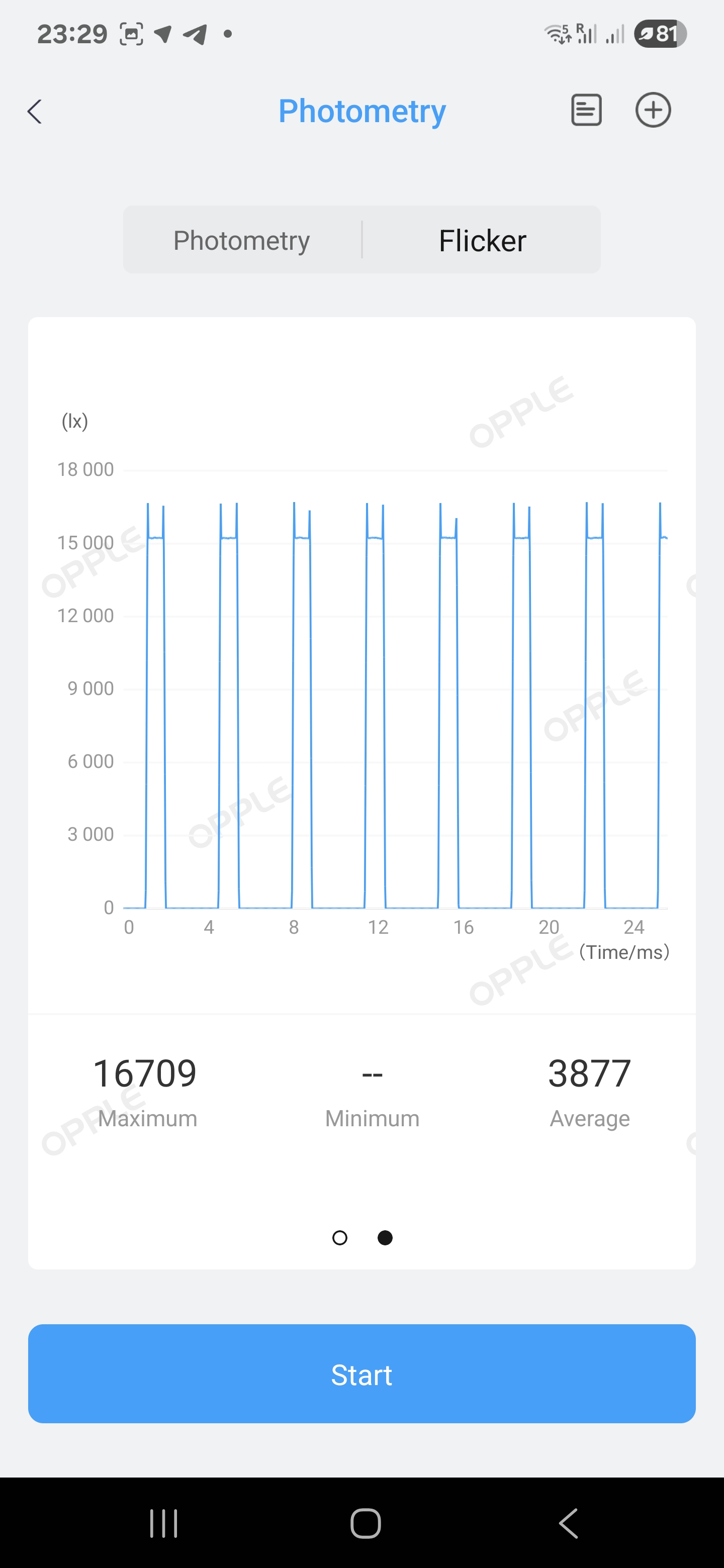 На минимальной яркости в широком пятне освещенность падает до 118 лк, индекс цветопередачи чуть подрастает до 93.0. В целом картинка по цветопередаче сохраняется, значения остаются стабильными. Но по мерцанию снова повторяется ситуация с высоким риском: глубина модуляции достигает почти 100 %, индекс фликера находится на уровне 0.75, частота около 300 Гц. Это выглядит как серия резких импульсов с падением света до нуля.