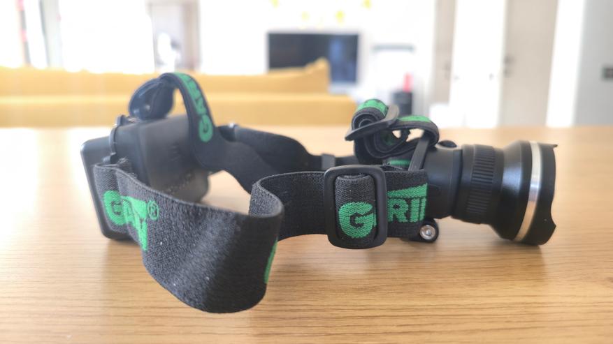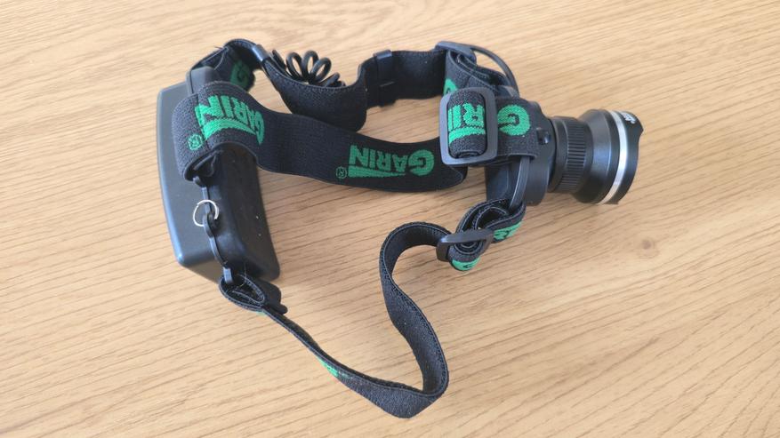 Эластичные ремни оголовья черного цвета с зелеными надписями Garin, они тянутся в трех направлениях и образуют крестообразную схему крепления, что помогает надежно удерживать фонарь на голове. По бокам ремни проходят через пластиковые фиксаторы и соединяются с корпусом фонаря, а сзади сходятся на аккумуляторном отсеке.