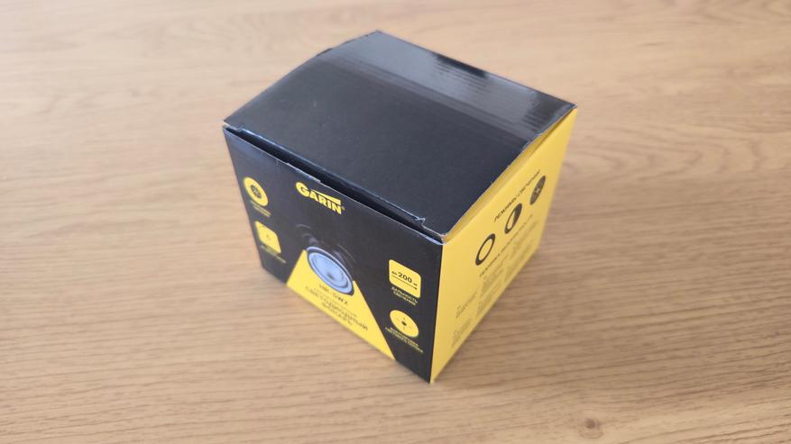Упаковка Garin HR-5WZ выполнена в черно-желтых тонах, на фронтальной стороне размещено название модели HR-5WZ и основные особенности: дальность свечения до 200 метров, до шести часов работы и возможность фокусировки светового потока.