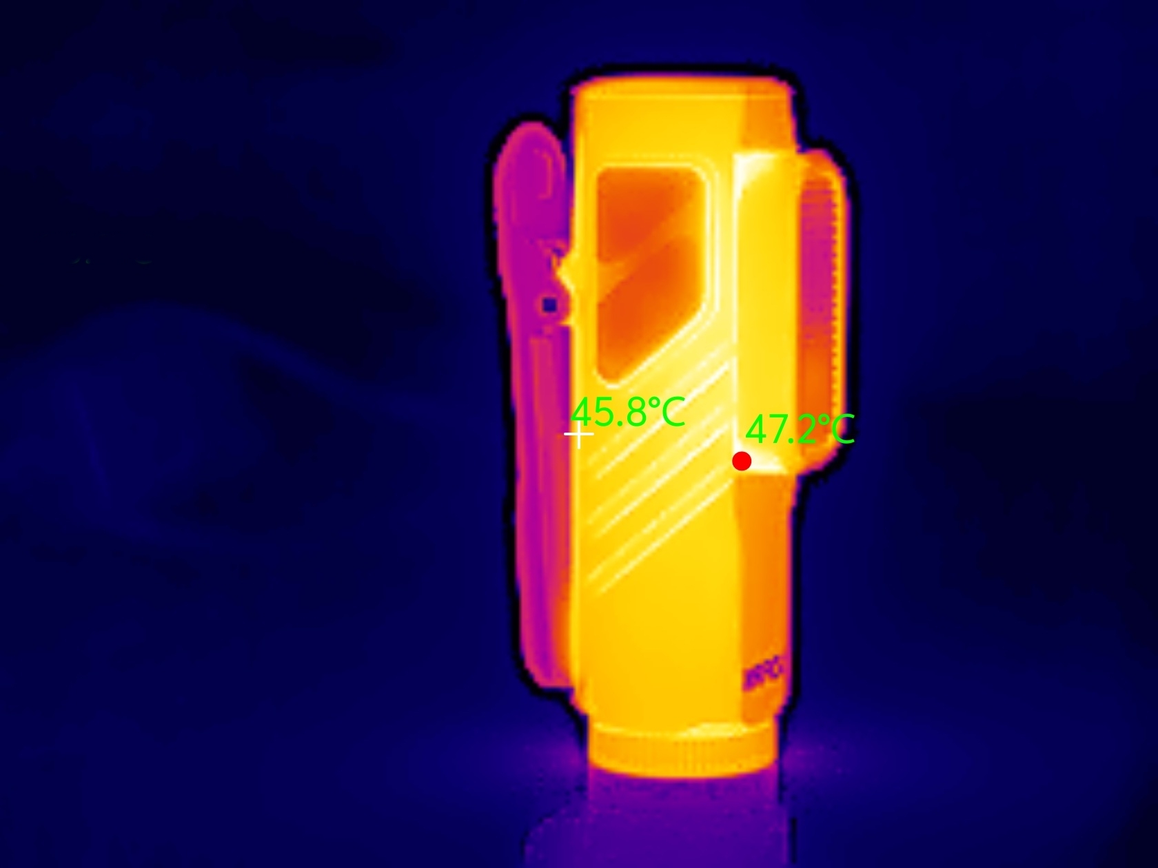 Максимальная температура корпуса, которую я зафиксировал при помощи тепловизора, была в районе 47 градусов. Фонарь при этом ощущается сильно теплым, почти горячим. Но это максимум (30 минут работы фонаря в режиме ближнего света на высокой яркости или 10 минут в режиме турбо). Когда яркость начинает понемногу падать и соответственно снижается нагрев, температура корпуса постепенно опускается к 33 градусам.