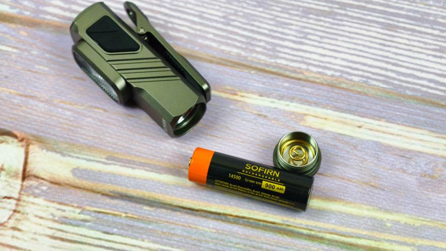 Комплектный аккумулятор под бредном Sofirn имеет заявленную емкость 900 mAh. Для подзарядки у него предусмотрен разъем USB-C прямо на корпусе аккумулятора. Не очень удобно, что для подзарядки аккумулятор нужно каждый раз доставать из фонарика, но зато фонарь лучше защищен от неблагоприятной погоды и без проблем выдержит даже сильный ливень (есть защита IPX6).
