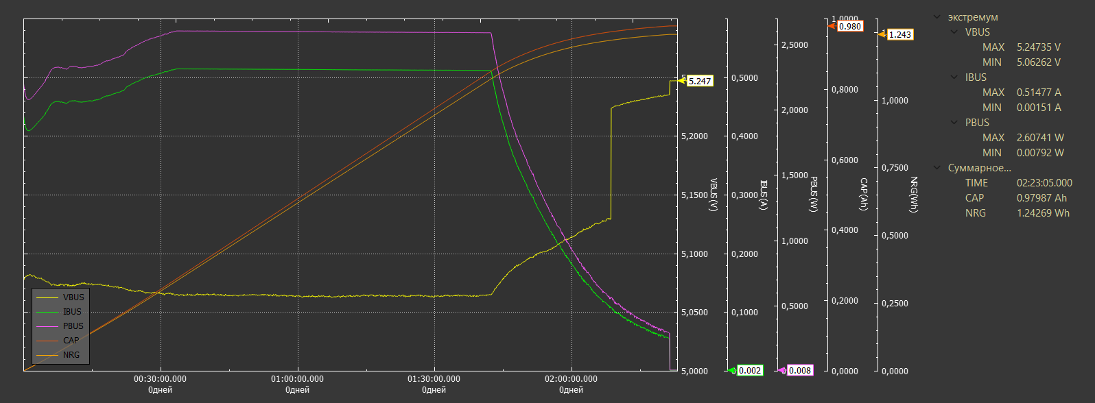 Перепроверил емкость аккумулятора. Залилось 979 mAh, что с учетом потерь на работу контроллера и преобразования напряжения является нормальным значением. Зарядка от 0 до 100% заняла 2 часа 23 минуты. Максимальная мощность зарядки составляет всего 2,6W.