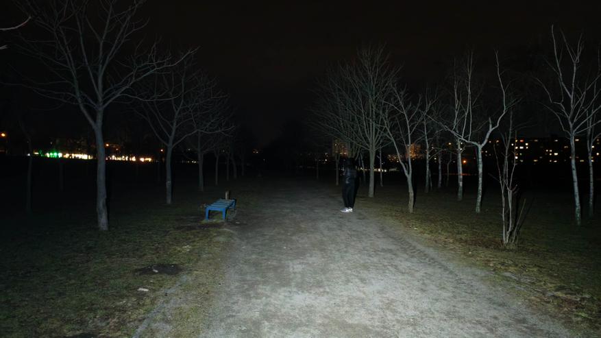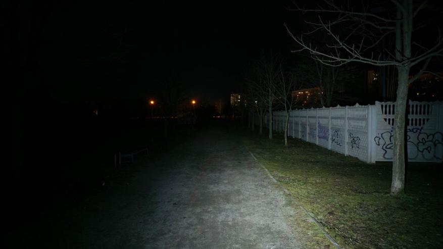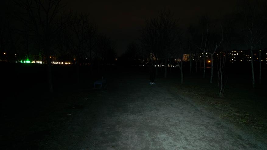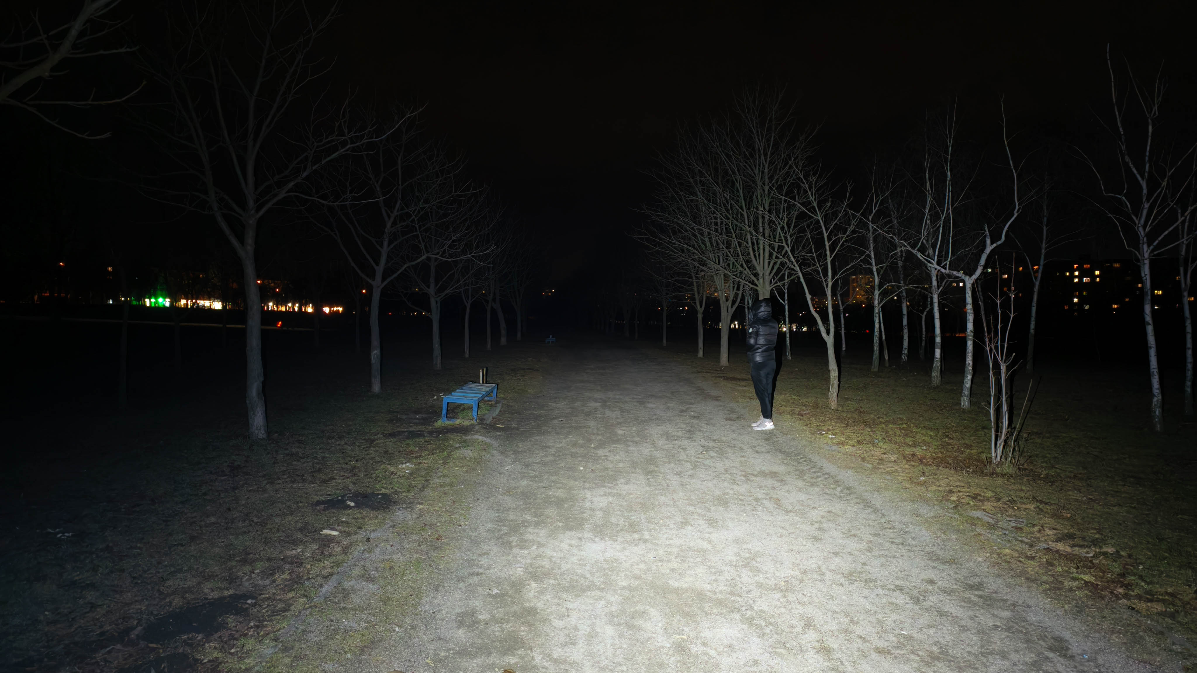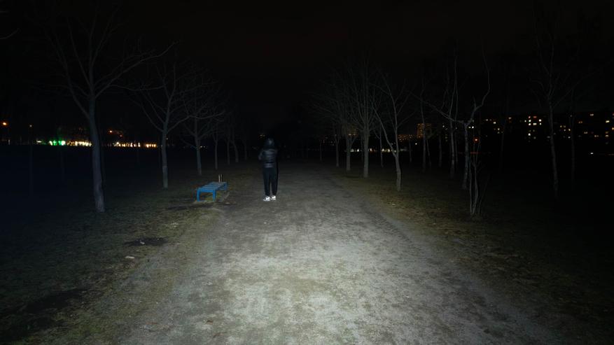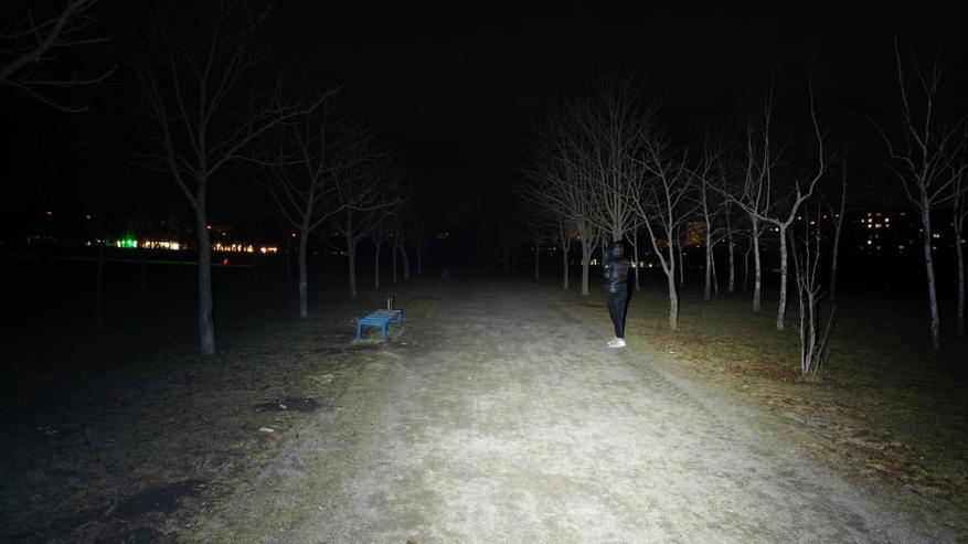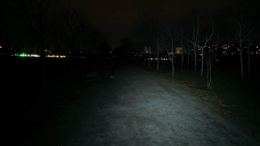 Ну и немного примеров работы на разных режимах. Начнем с режима дальнего света. Низкий уровень яркости показывать смысла особого нет, так как там в принципе не особо ярче свет, чем у фонарика среднестатистического смартфона, поэтому начну сразу со средней яркости. Ее достаточно, чтобы немного подсветить дорогу на несколько метров вперед (примерно до 10 метров), но при этом не слепить проходящих мимо людей. Световое пятно более концентрировано в центре, но и по краям освещение присутствует (обочину захватывает).