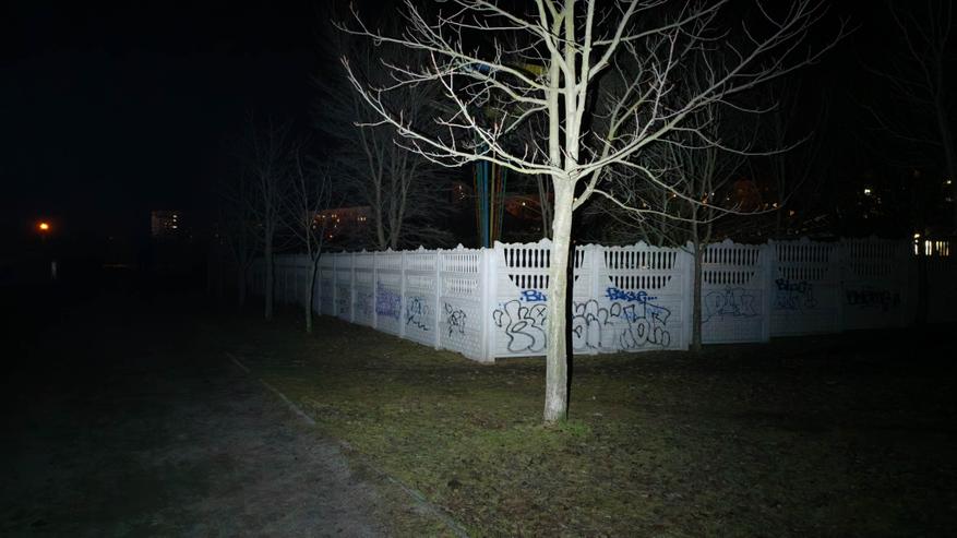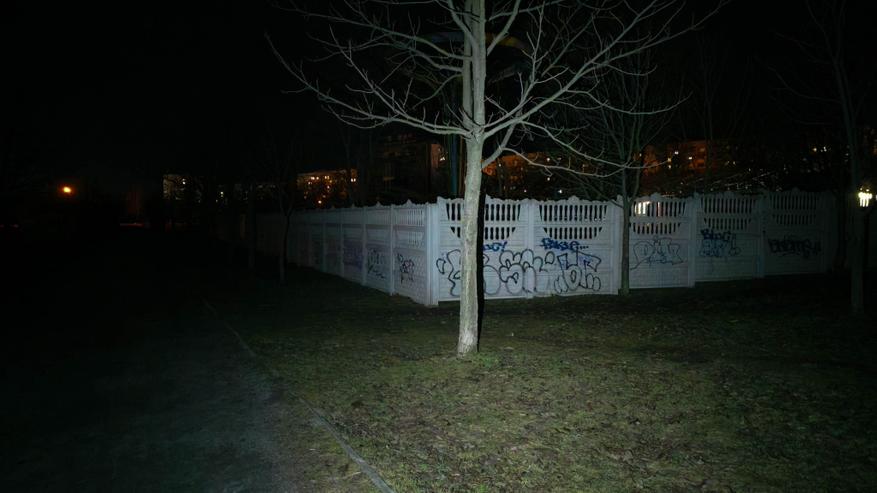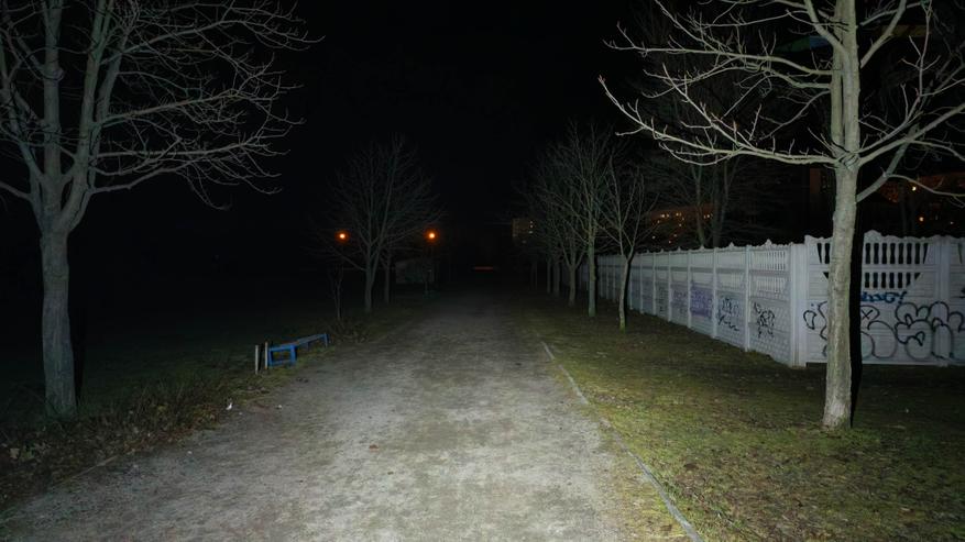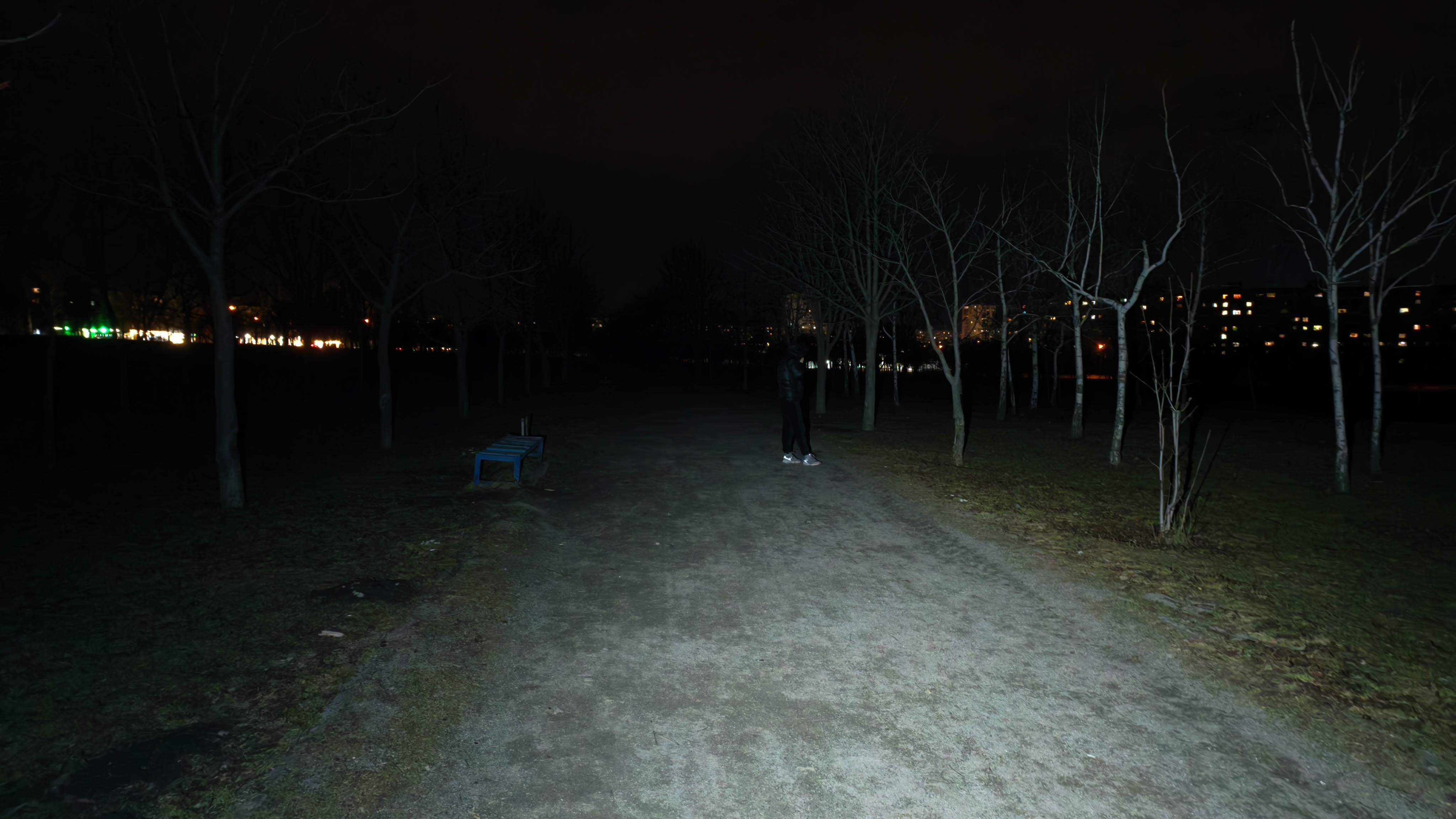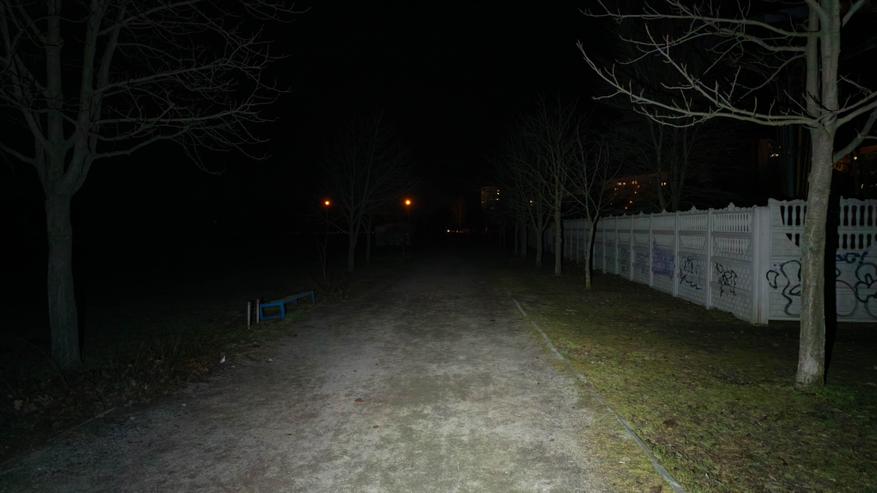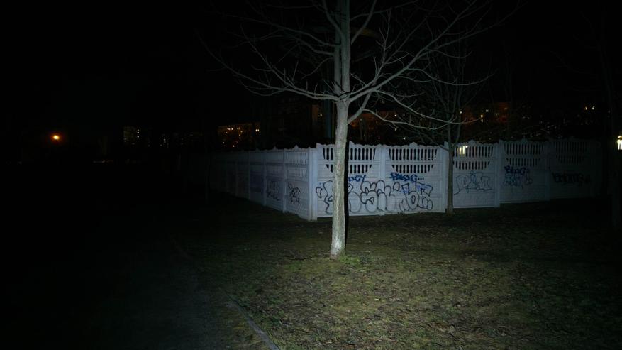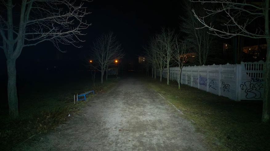 Ну и немного примеров работы на разных режимах. Начнем с режима дальнего света. Низкий уровень яркости показывать смысла особого нет, так как там в принципе не особо ярче свет, чем у фонарика среднестатистического смартфона, поэтому начну сразу со средней яркости. Ее достаточно, чтобы немного подсветить дорогу на несколько метров вперед (примерно до 10 метров), но при этом не слепить проходящих мимо людей. Световое пятно более концентрировано в центре, но и по краям освещение присутствует (обочину захватывает).