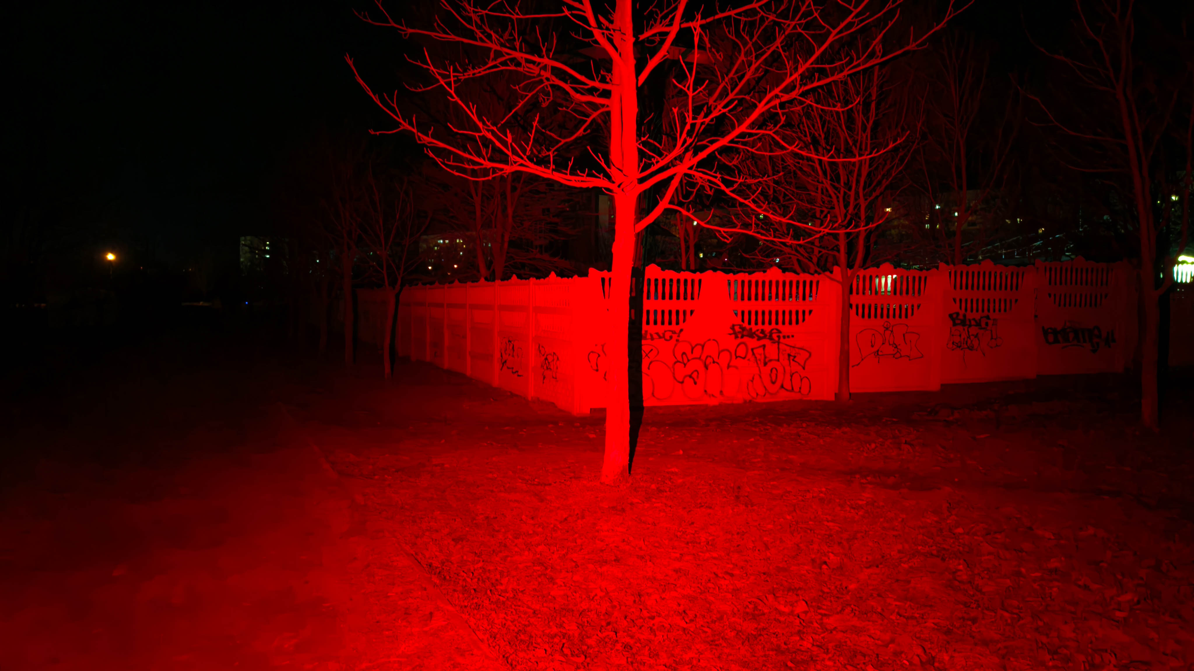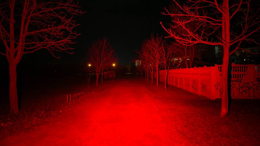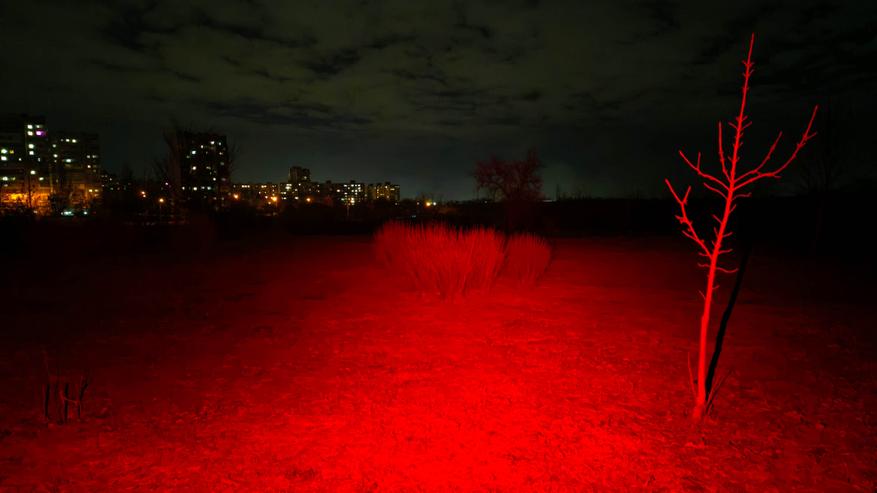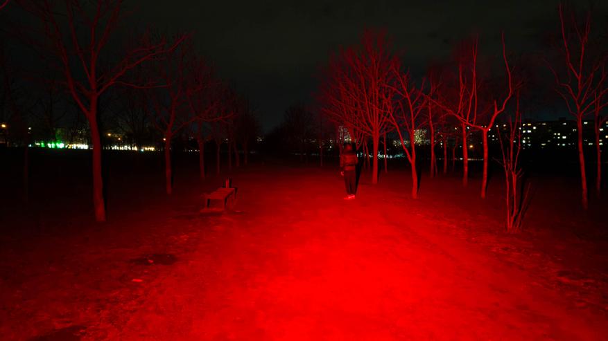 Напоследок покажу как светит фонарь в режиме красного света. Неожиданно, но яркость вполне приличная и режим рабочий. Вот примеры на высокой яркости.