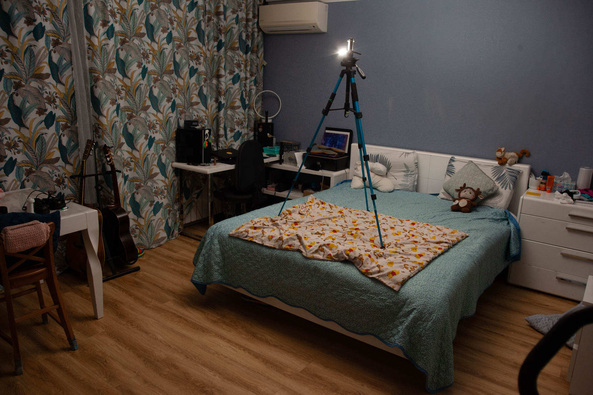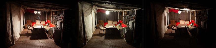 Вот так он светит, для сравнения — под плафоном 9Вт светодиодная лампочка с температурой в 5000к. Одно крыло под потолком как на фото выше и штатив на высоте где-то в метр, раскрыты оба крыла. В обоих случаях света хватает даже для чтения.