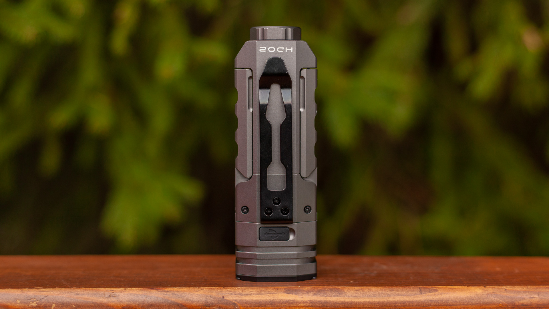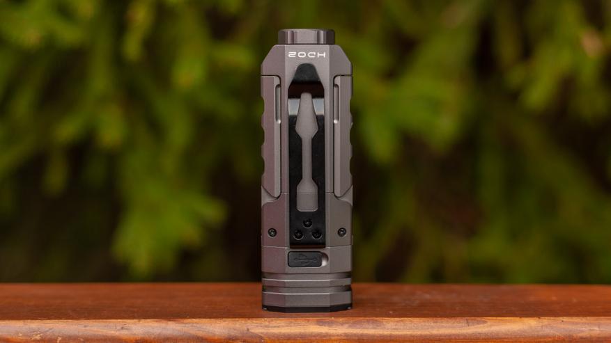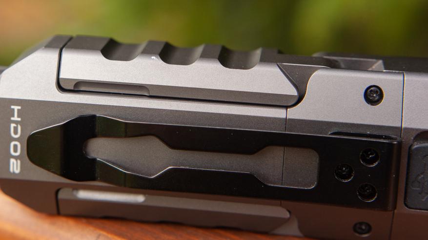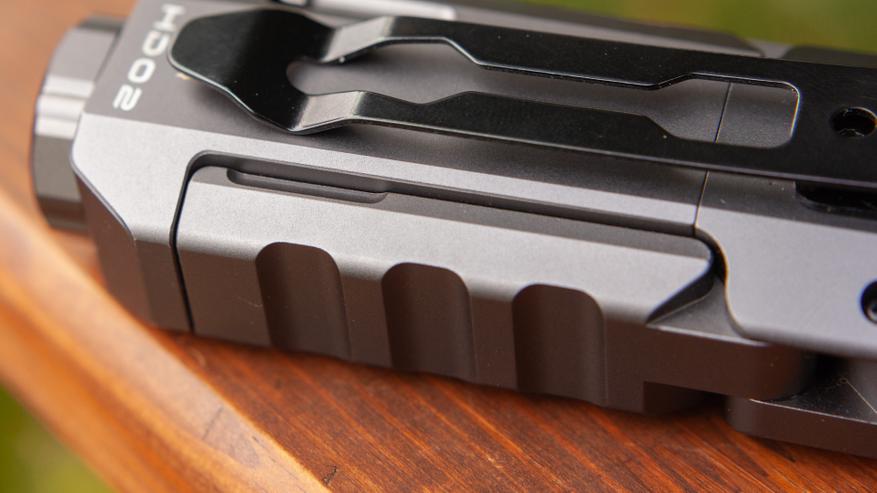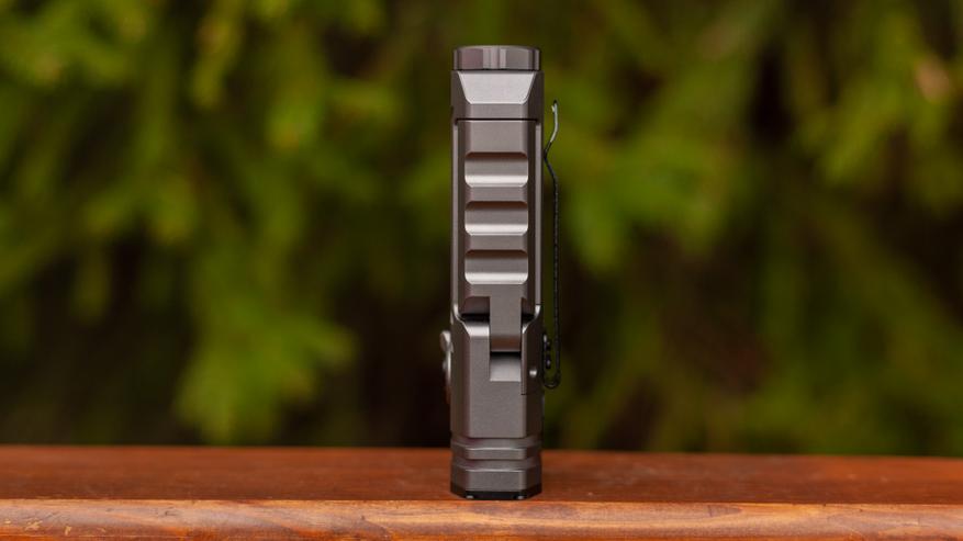 Клипса на тыльной стороне односторонняя и для меня осталось загадкой различная ширина выемки. Подобное обычно вижу в креплениях, когда нужно продеть голову винтика, чтобы что-то подвесить. Явно что никто не будет так крепить фонарик… может быть нужно было уменьшить вес клипсы и сделали такой художественный вырез? Если вы всё же видите в нём какую-то функциональность, пишите в комментах. Кстати, в фонарике нет отдельного отверстия под темляк, его придётся цеплять к клипсе.