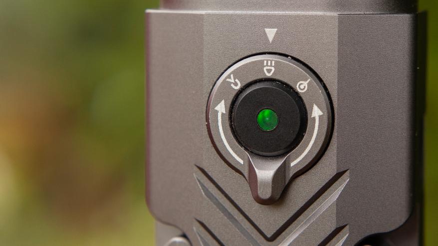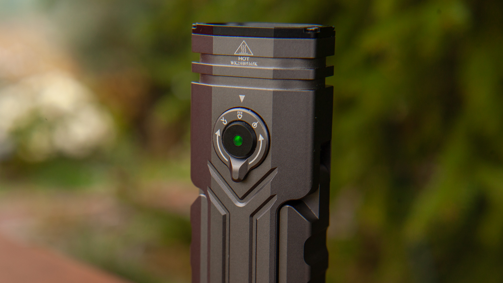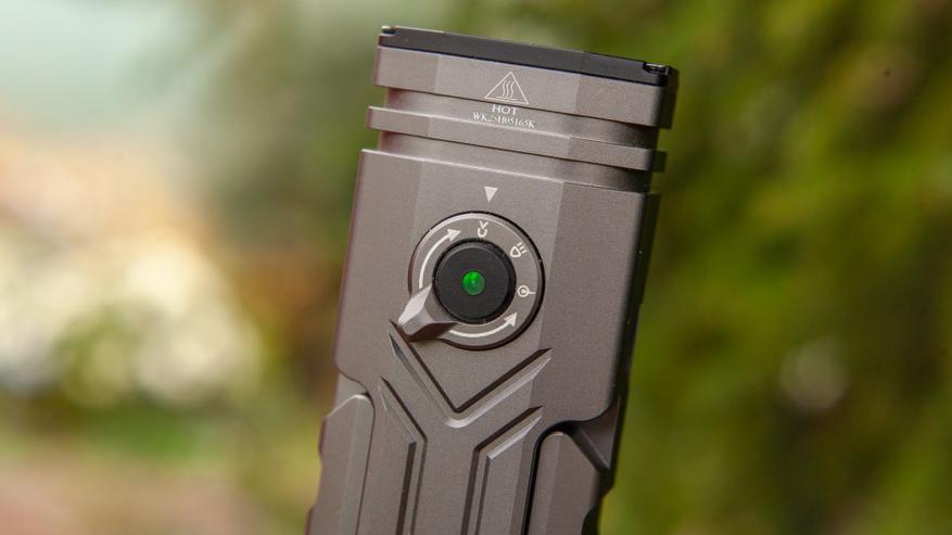 Wurkkos HD02 управляется с помощью трёхпозиционного тумблера и кнопки в его центре. Как обычно, в центре кнопки встроен красно-зелёный индикаторный светодиод, который указывает на состояние процесса зарядки и по включении фонарика показывает приблизительный заряд аккумулятора.