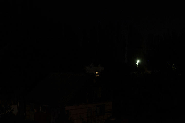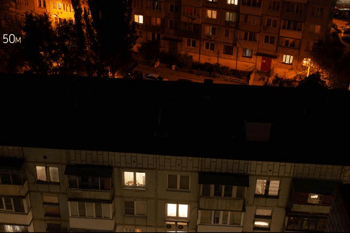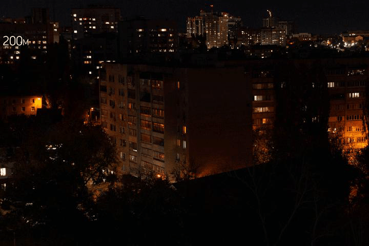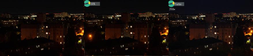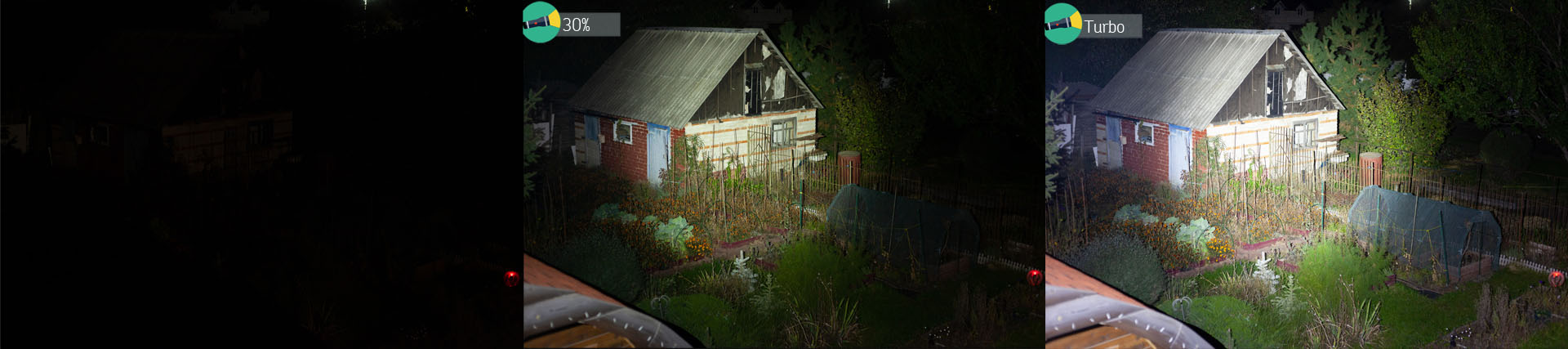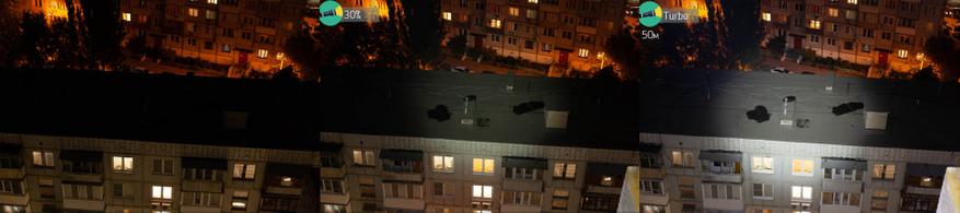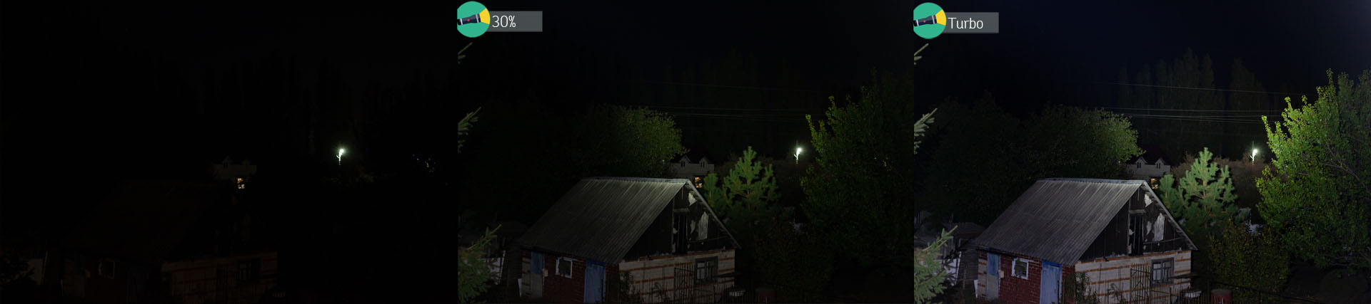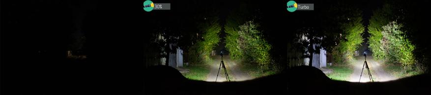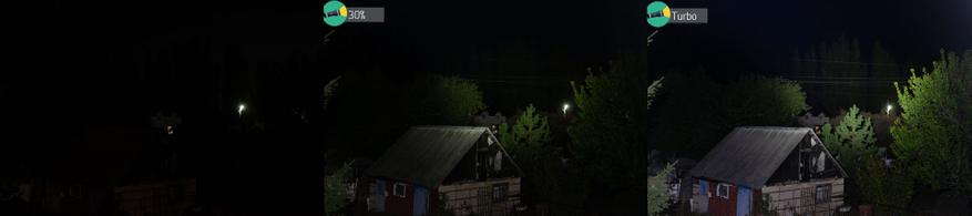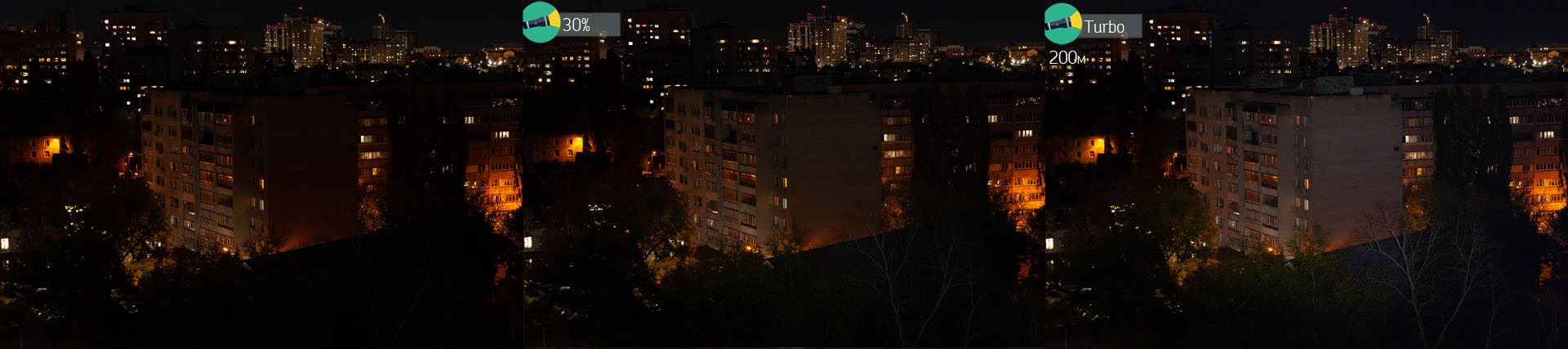 А вот и основной свет, тут турбо и те самые 30%, на которые она выходит. Как видите эта треть светит существенно ярче, чем обычно требуется для прогулки, свободно можно работать на дистанции в 50-75м. Кое-как, без деталей, можно пробить и на 200м, впрочем. Этим-то и хорош SFT70.2 светодиод — он дедомленный, а значит даёт более сфокусированный свет. И получается что есть и большая яркость, и приличная дальнобойность. Но без «шила»,