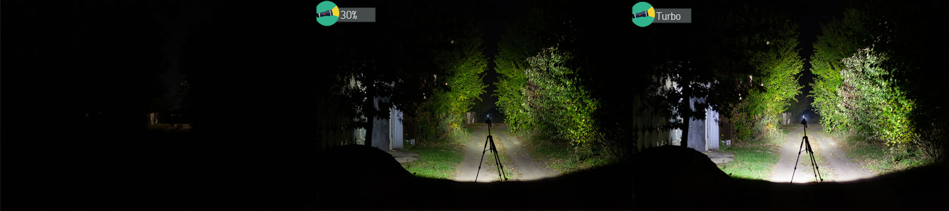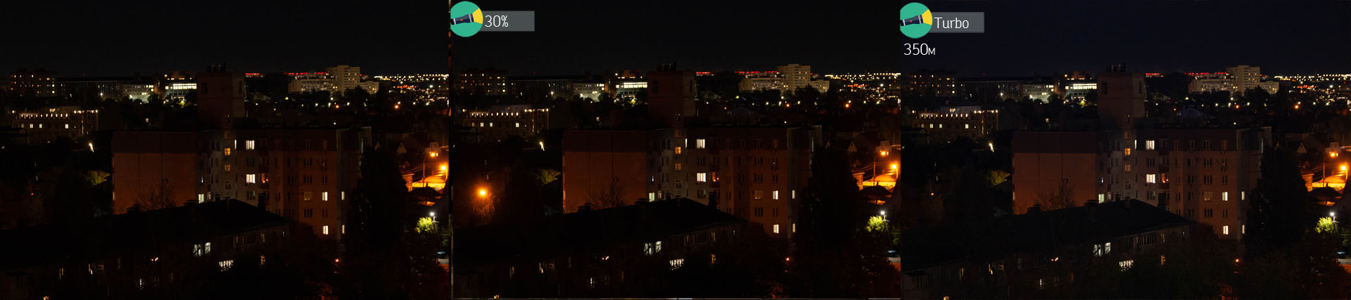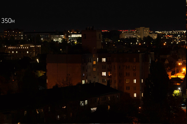 Максимальная дальнобойность для фонарика заявлена в 330м и вроде бы он даже что-то там высвечивает на дистанции в 350м. но это совсем гомеопатическая яркость, так что для меня предел полезной дальнобойности тут в паре сотен метров с небольшим.