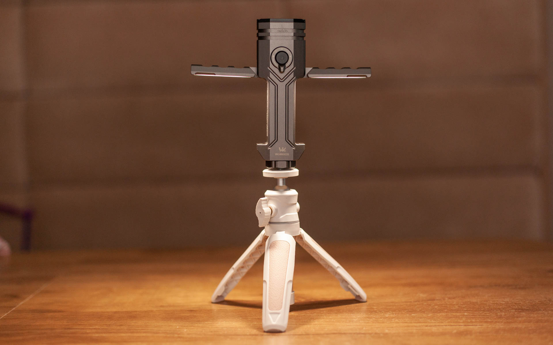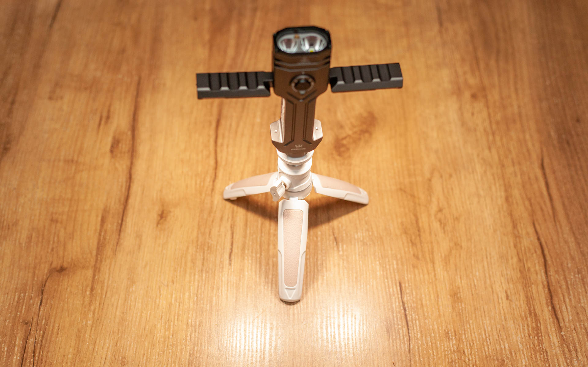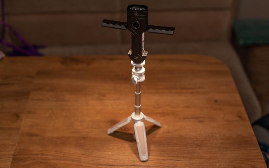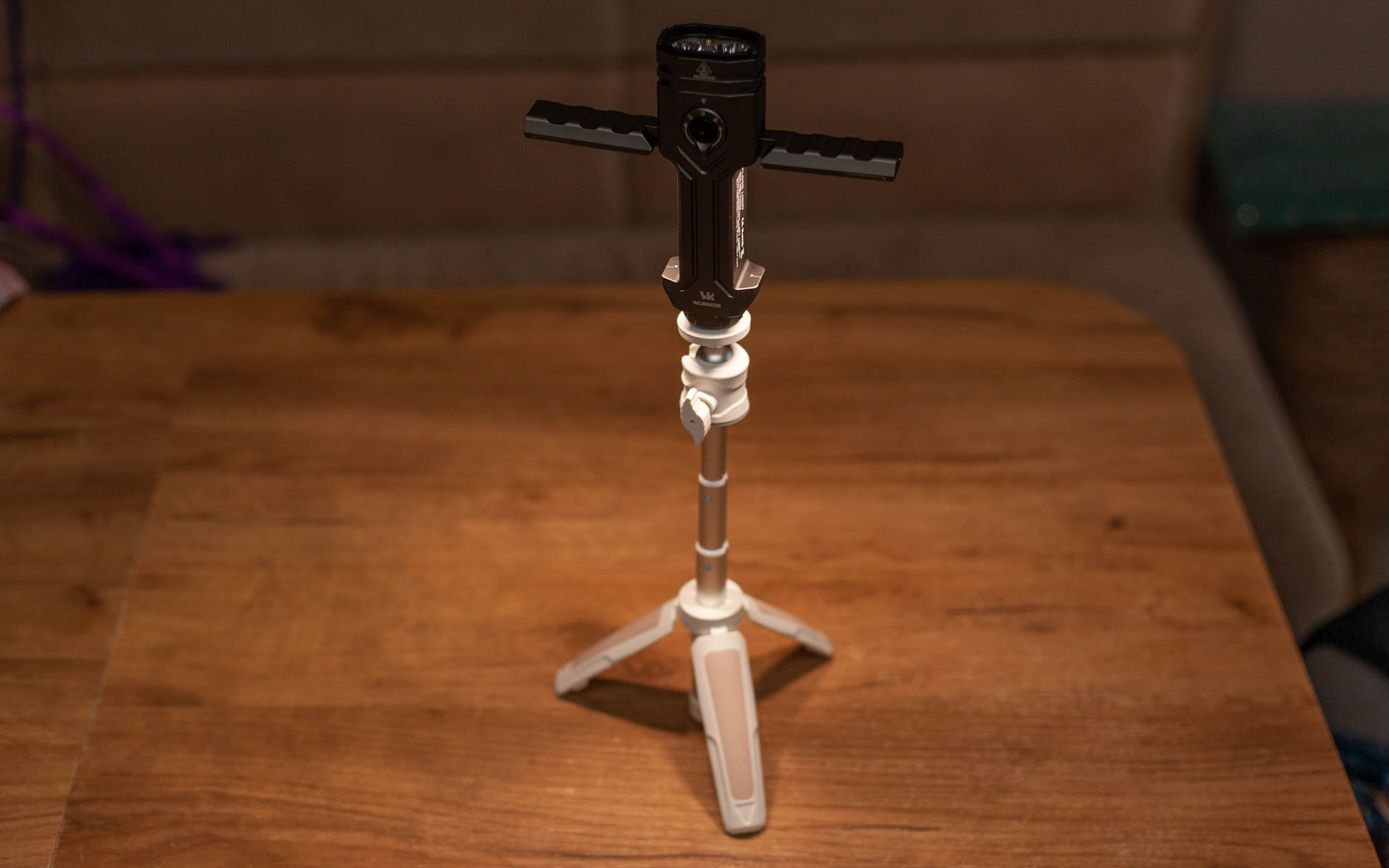 Также есть стандартная штативная резьба в 1\4, что совершенно логично при таком функциональном довеске как светодиоды в крыльях. Wurkkos, кстати, продают и штатив тоже. У него небольшие размеры, аккурат, чтобы поставить фонарик на стол. Ниже, когда посмотрим как светит Wurkkos HD02, я покажу его вместе со штативом.