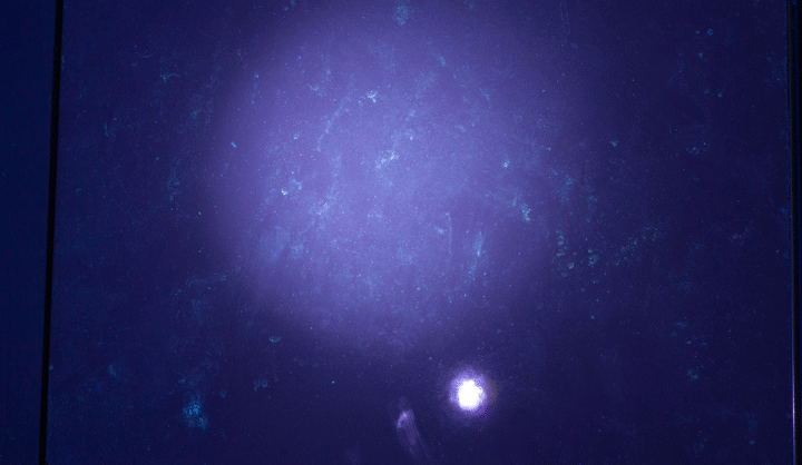 Тут правильный ультрафиолетовый свет с длиной волны в 365нм. Иногда ставят 395нм, толку от которых чуть больше чем от глубокого фиолета. А 365нм показет всё что вы хотите, и даже не хотите (зайдите в ванную комнату и включите) увидеть.