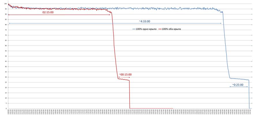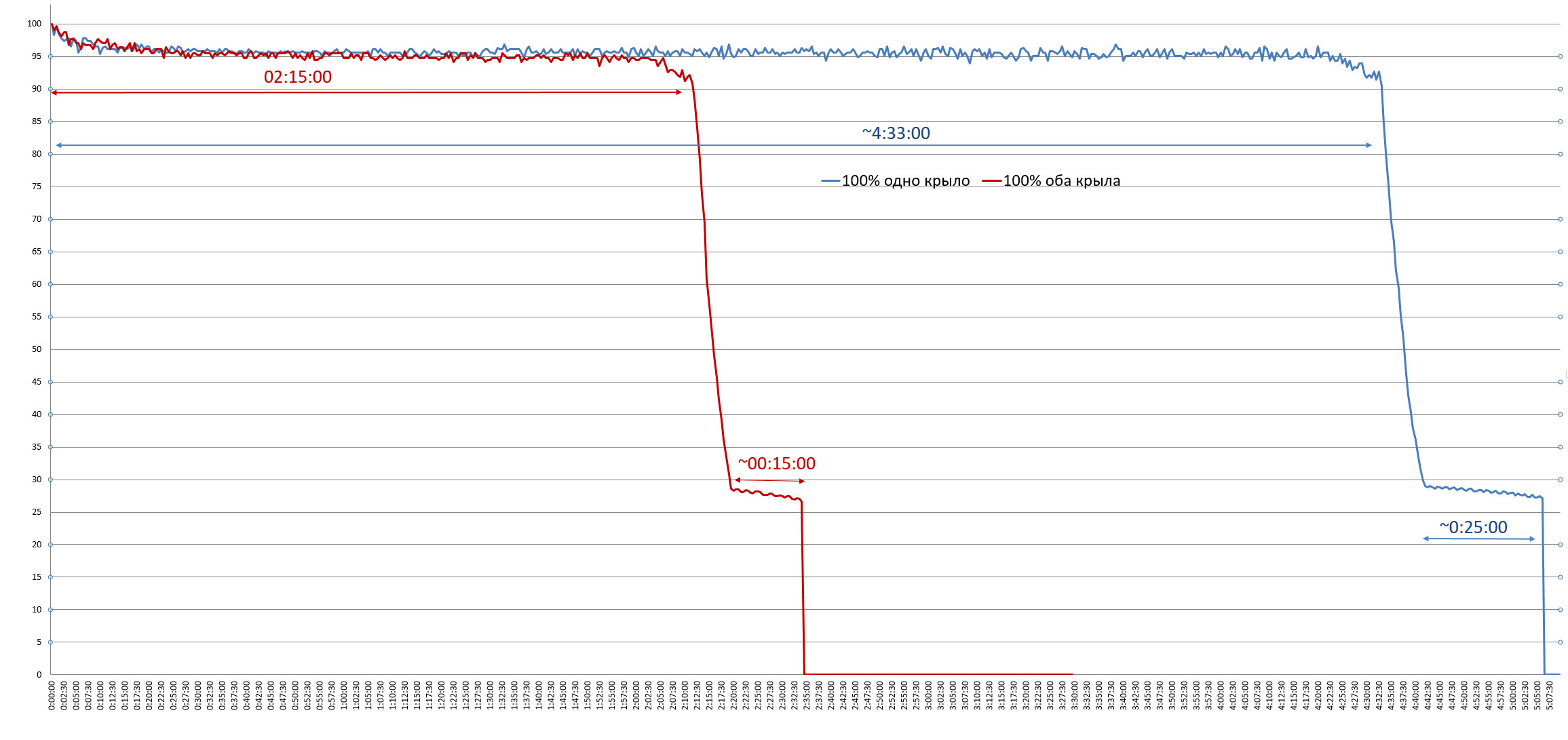 Очень порадовал боковой свет. Тут я ожидал что максимальна яркость будет непродолжительной, до срабатывания термоотсечки — все-таки панели крыльев тут небольшие. Но, очевидно, хватает, как размера, так и теплоотвода и фонарик стабильно держит эту яркость, проседая лишь на несущественные 5%. 2ч 15 минут на полной яркости (+ 15 минут запас на 30% от неё) или четыре с половиной часа на одном крыле (т.е. условных 125-150люм) и еще почти полчаса на чем-то типа 40-50 люменах. И это при том, что свет тут направлен вниз и не теряется впустую, вполне возможно что хватит и одного крыла.