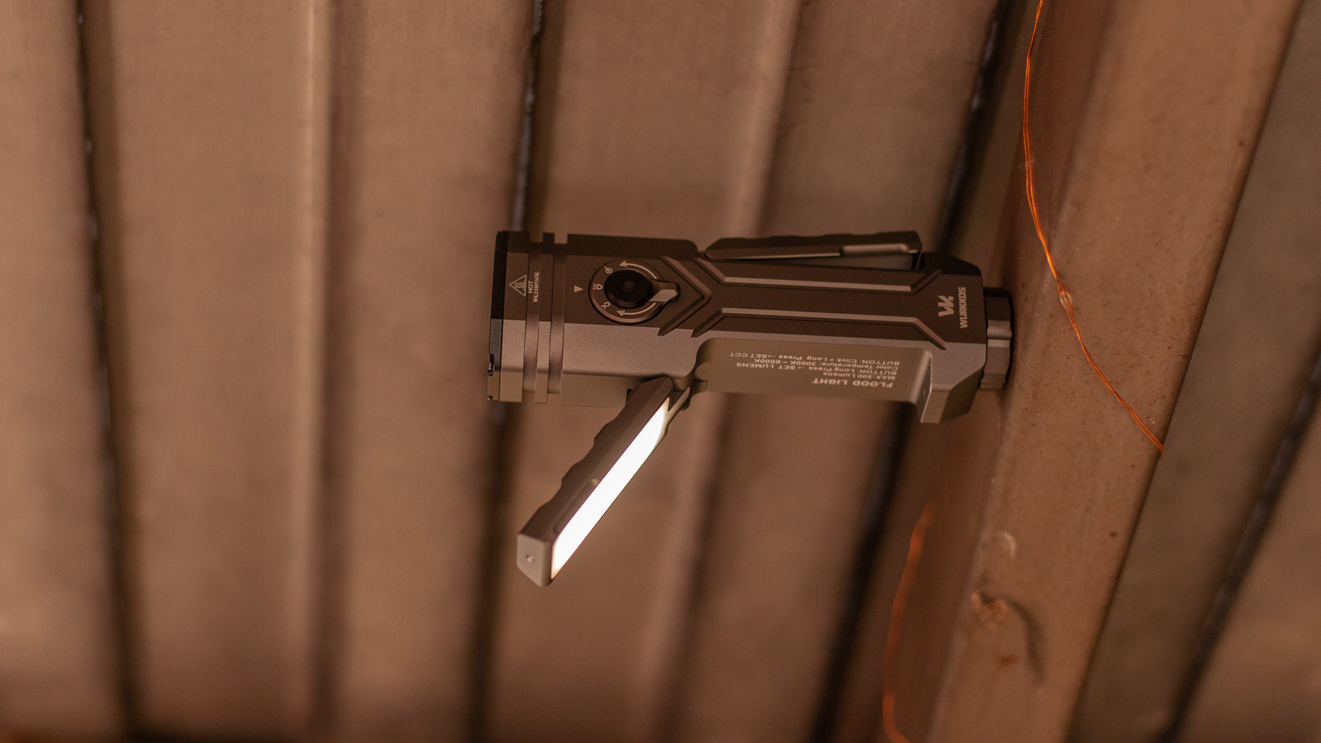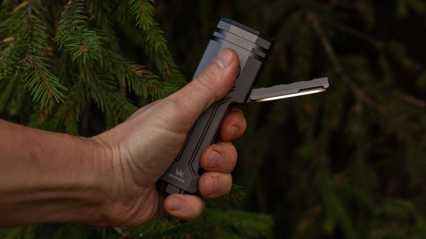 Также примечательно что «крылья» открываются чуть выше горизонтали и светят как вместе, так и по отдельности. Технически, кстати можно держать фонарик с одним поднятым крылом в руке, освещая перед собой путь.