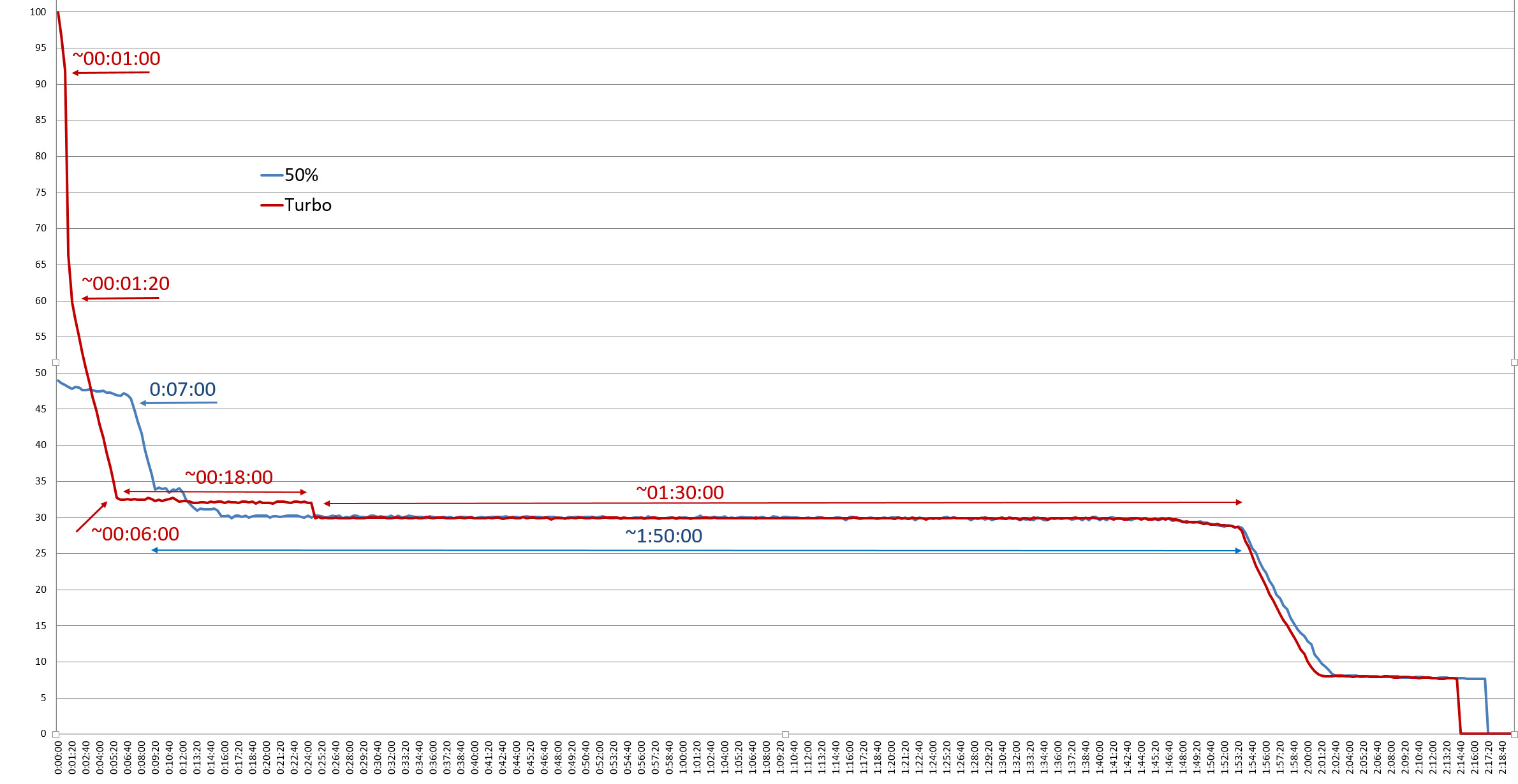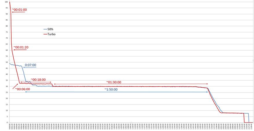 Турбо тут слишком яркое и горячее, чтобы охлаждение дало какой-то явный прирост во времени работы (тут что-то иное может быть только при использовании зимой). На графике линия пикирует вниз, но это в силу общего его масштаба. Так-то на минуту с холодного старта рассчитывать можно.