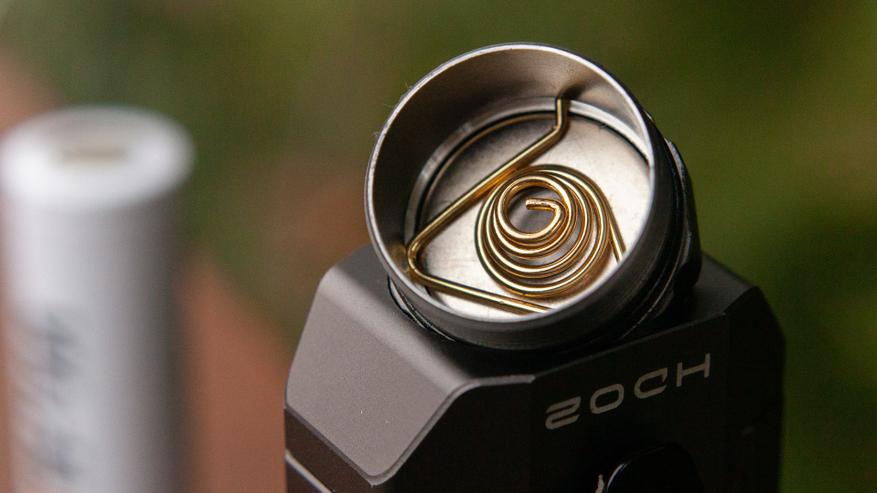 Пружина в хвосте толстая, одинарная. Радует что есть пружина и со стороны головы тоже, ведь тут могли бы обойтись и пятаком контакта. Также это полезно и в тех редких случаях, когда фонарик падает головой вниз, пружина амортизирует удар аккумулятора по драйверу.