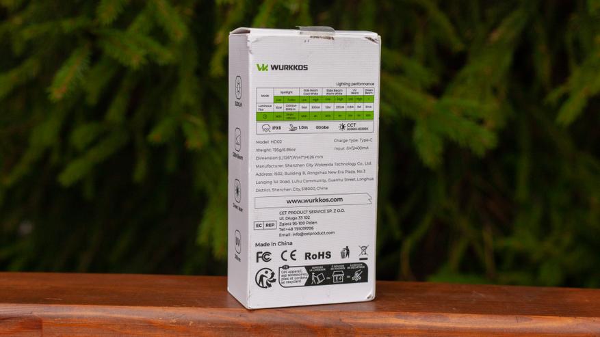 Как обычно — белая коробка из текстурированного картона. Спереди — минимализм, только фотография фонарика и название модели. На задней стороне: таблица с яркостью-временем, размер-весом и контактные данные.