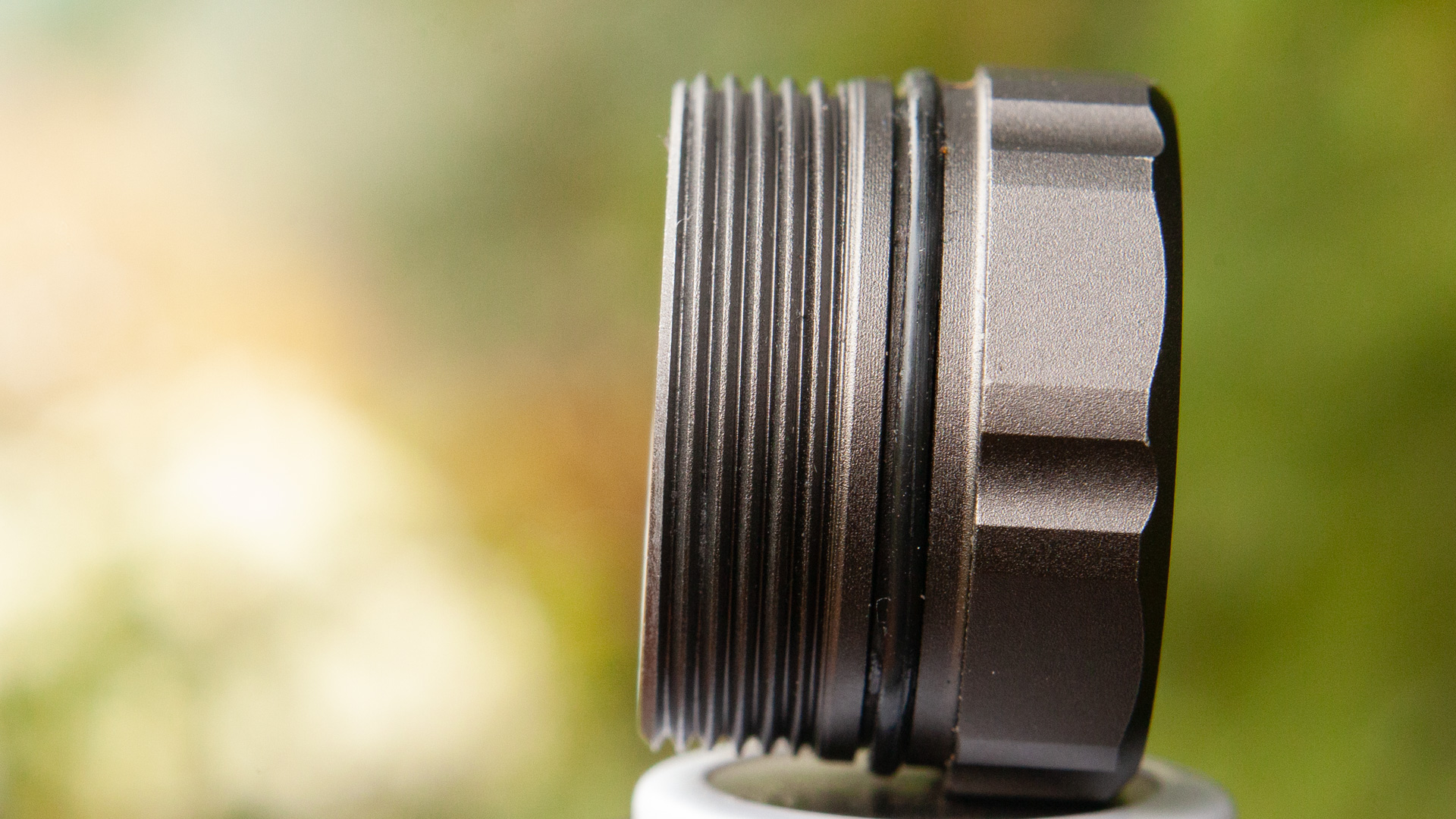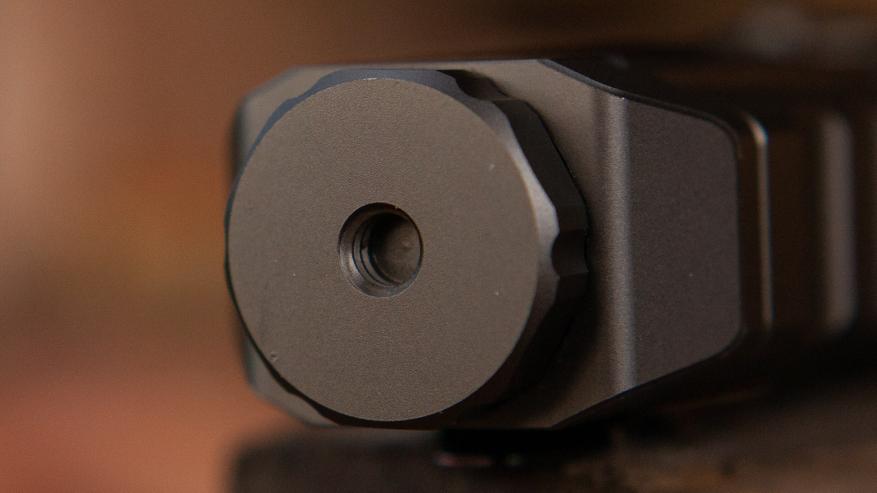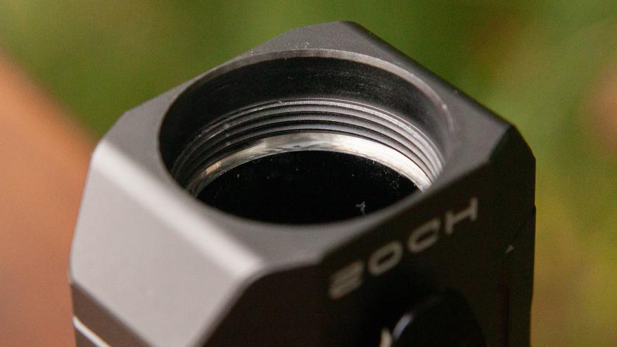 В нижней части корпус находится выступающая крышка батарейного отсека. Резьба в крышке и батарейном отсеке сравнительно небольшая, треугольная, анодированная. 3 факта, которые нужно упомянуть про крышку: