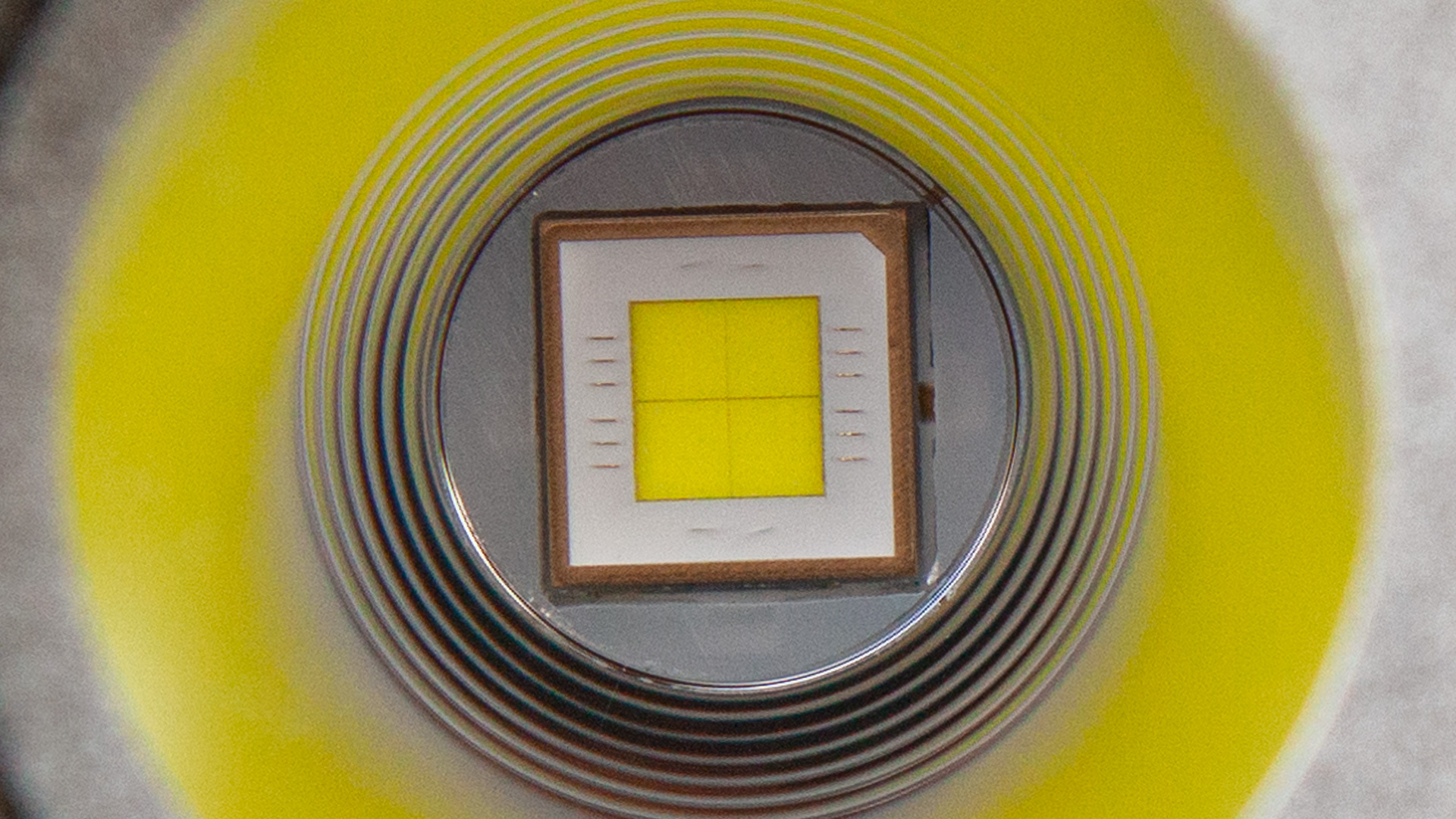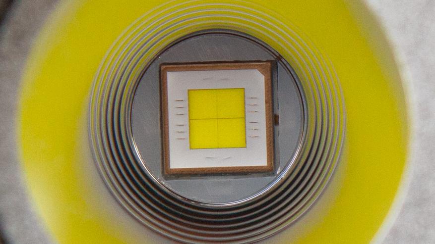 Пришло время посмотреть на светодиоды. Этот набор сам по себе сделал бы фонарик необычным, даже не будь в нём крыльев. Имеем Luminus SFT70.2 в качестве основного света, УФ 365н светодиод и зелёный лазер! Все светодиоды спрятаны под стекло с просветлением. Первые два находятся на дне глубоких рефлекторов, лазер же уведён совсем глубоко. Кстати, обратите внимание на рефлектор у SFT70.2 — на то его части, что соседствует со светодиодом видны концентрические полоски. В первый раз вижу подобное!
